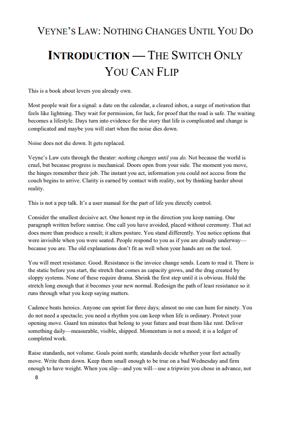 Change does not arrive on a calendar. It starts the moment you act. Veyne’s Law: Nothing Changes Until You Do is a compact field manual for readers who are done waiting.