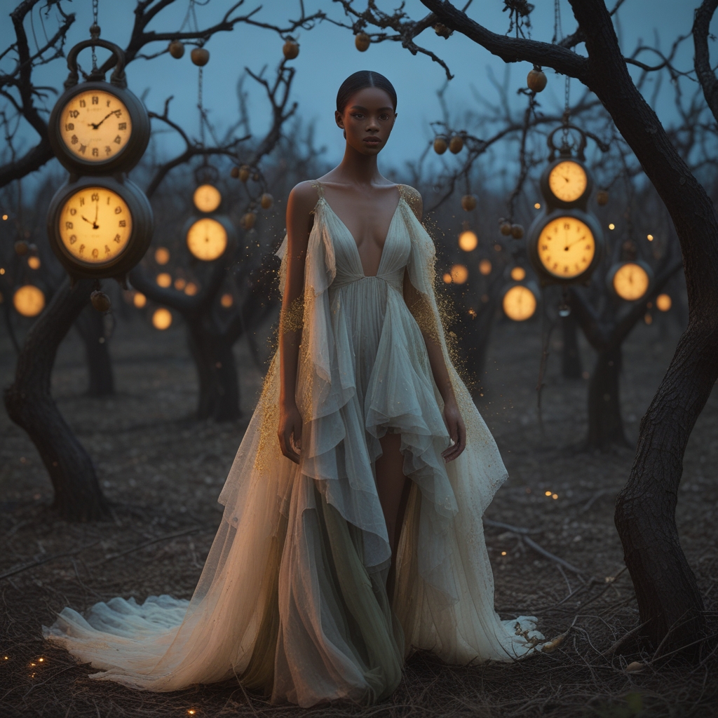 “Artistic portrait of a model wandering through a dormant orchard at twilight, where antique clocks hang from gnarled branches, each showing a different time, their faint, uneven ticking resonating through the still, dusky air. She wears layered, flowing gowns in soft ivory and pale moss, the delicate fabrics drifting around her like ethereal fog, blending nobility with wild grace. Her features are serene and sculpted, with high cheekbones, full lips, and warm golden-brown skin that glows in the fading light. The scene is illuminated by uncanny, warm lighting: sunset hues melting into soft candlelight, with rings of flickering fire reflected from the clock faces, casting subtle shadows across her path. The color palette is rich and painterly—weathered bronze, honeyed amber, dusky blue, and pale moss—enhancing the sense of time suspended. Gold dust clings to her hands and the edges of fabric, catching the light, symbolizing beauty and memory trapped between fleeting seconds. Hyper-detailed textures, cinematic depth of field, ethereal, dreamlike, timeless atmosphere.”