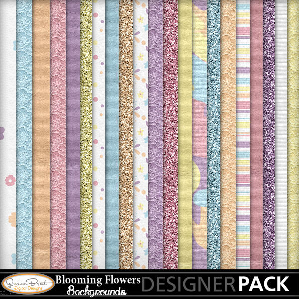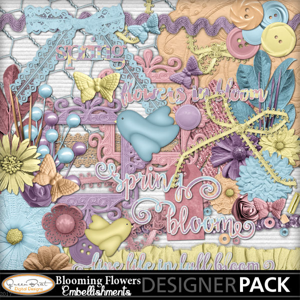 The kit features beautiful blossoms of spring! It includes plenty of flowers, lace, ribbons, and other embellishments with cardboard and glitter backgrounds. Done in springish pastel colors this kit is a must have and would be great for all your Spring, Easter, or Mother's Day projects.
