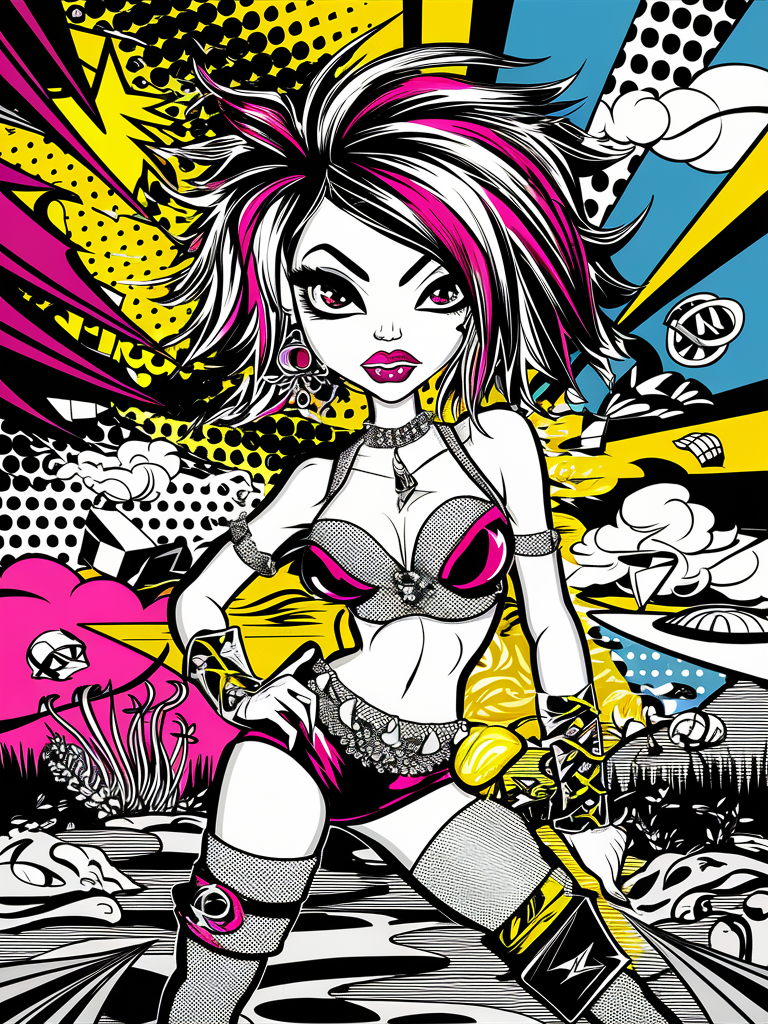A vibrant and dynamic pop art-inspired composition featuring a Bratz-style.