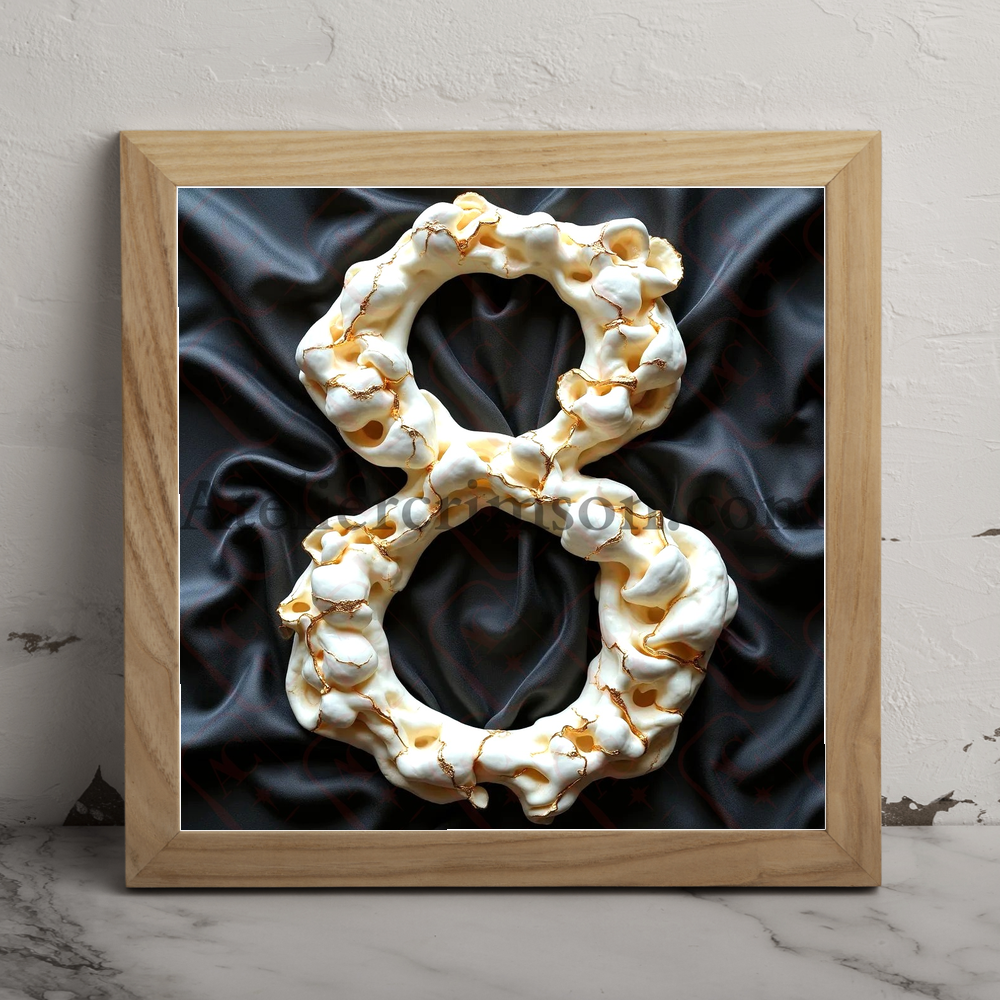 Number 8 Bones with gold fissures A hauntingly beautiful character crafted from pristine human femur bones, intricately arranged to form a bold, serif typeface. Delicate golden fissures, reminiscent of kintsugi art, weave through the ivory-white osseous structure, adding an element of elegant repair. The character stands proudly on a luxurious marbled floor, its form casting subtle shadows. Behind it, a textured black linen backdrop provides a striking contrast, emphasizing the letter's ethereal beauty.