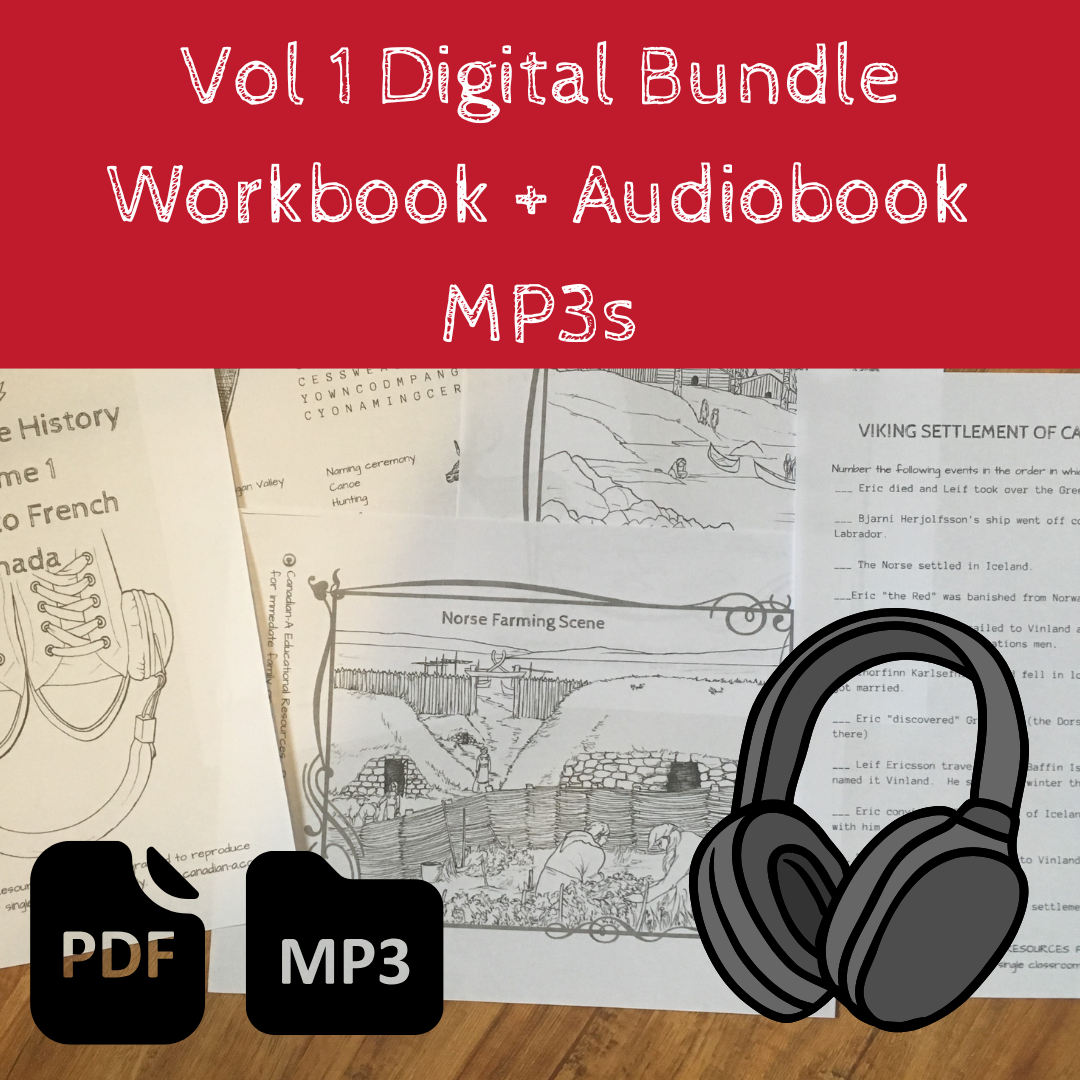 The Headphone History Volume 1 Workbook contains colouring pages, word finds, crosswords, questions and quizzes on all of the Volume 1 Topics and is reproducible for your family or classroom. Students listen to the audio while colouring the corresponding pictures, then complete the age-appropriate lesson sheets. There are even copy work pages for younger students! Both the Workbook and the Audiobook MP3s include: Canadian Landform Regions, Early Migration and Canada's First People, First Nations Cultural Groups, The Norse Culture and Settlement, Thule Migration and Inuit Culture, European Exploration, Acadia and New France.