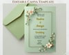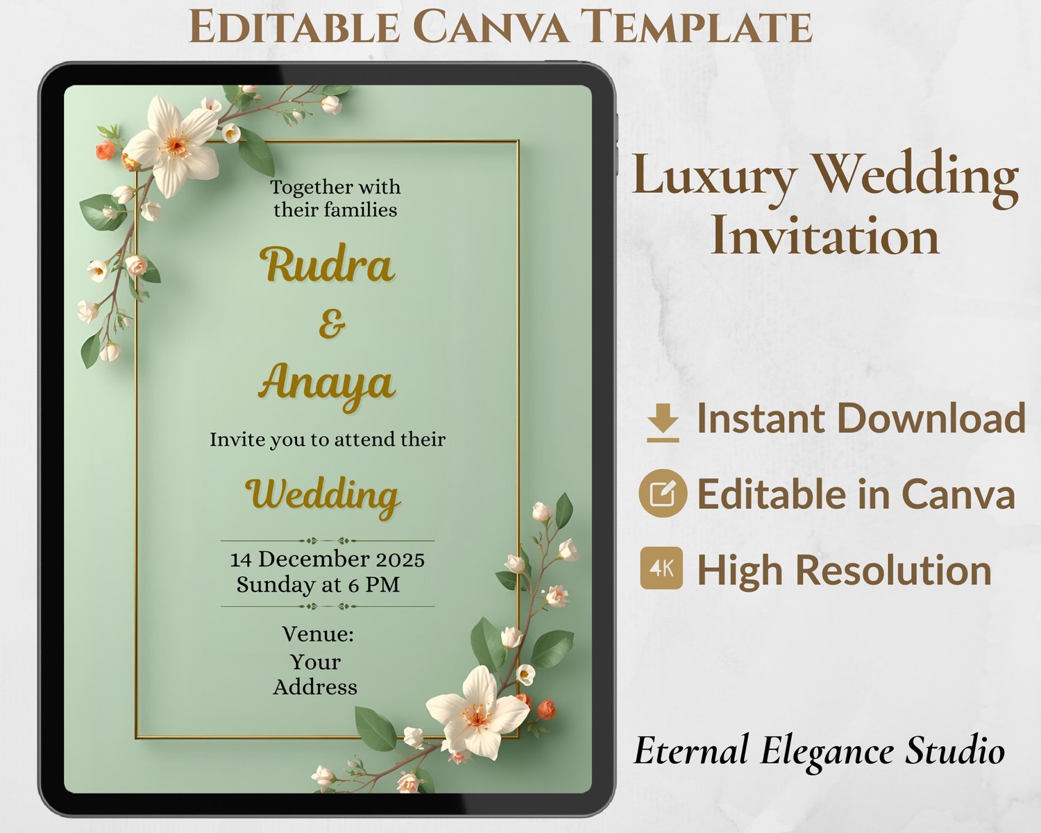 Elegant Sage Green Floral Wedding Invitation – Editable Canva Template – Modern Gold Frame Invite (Digital Download)