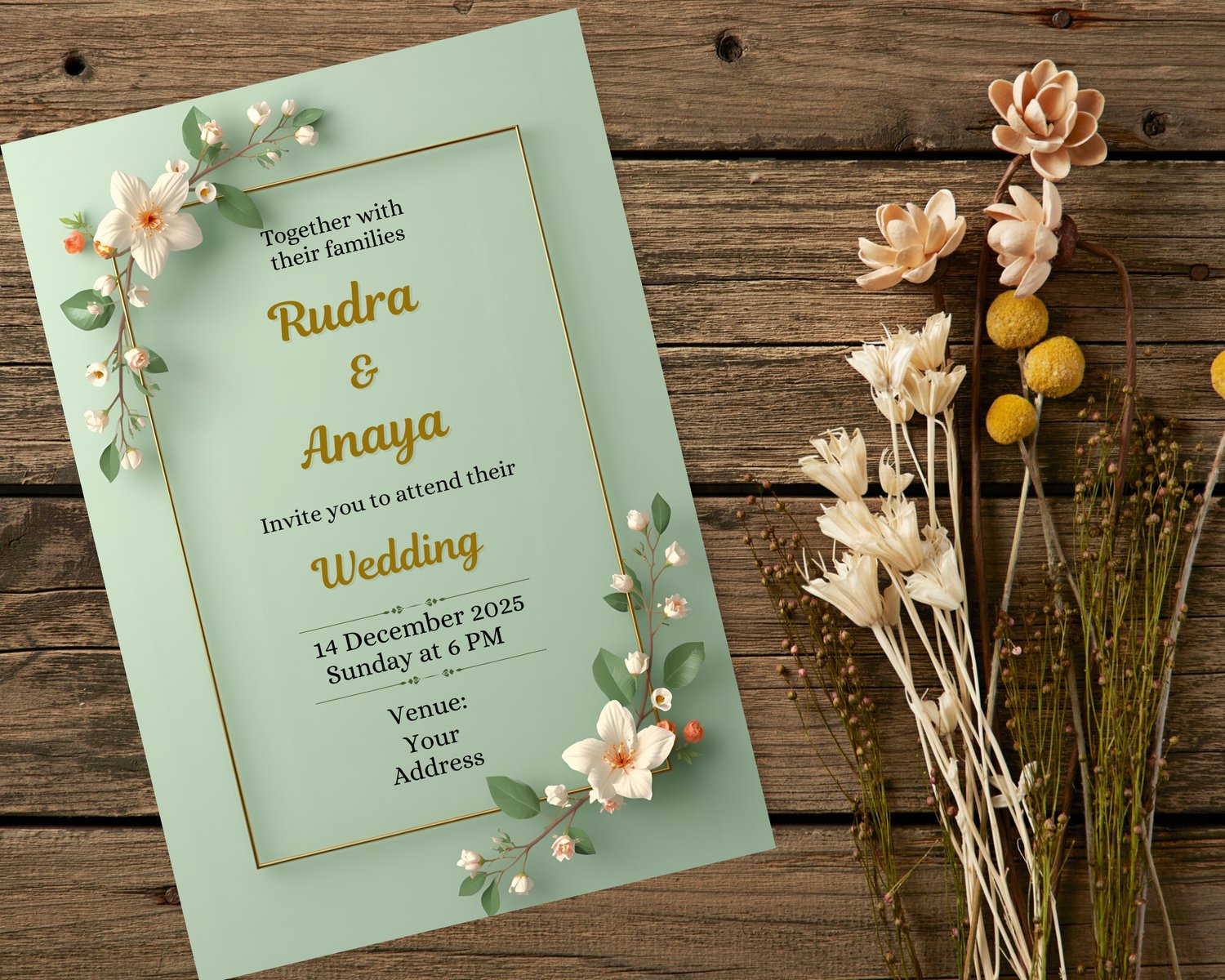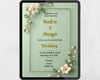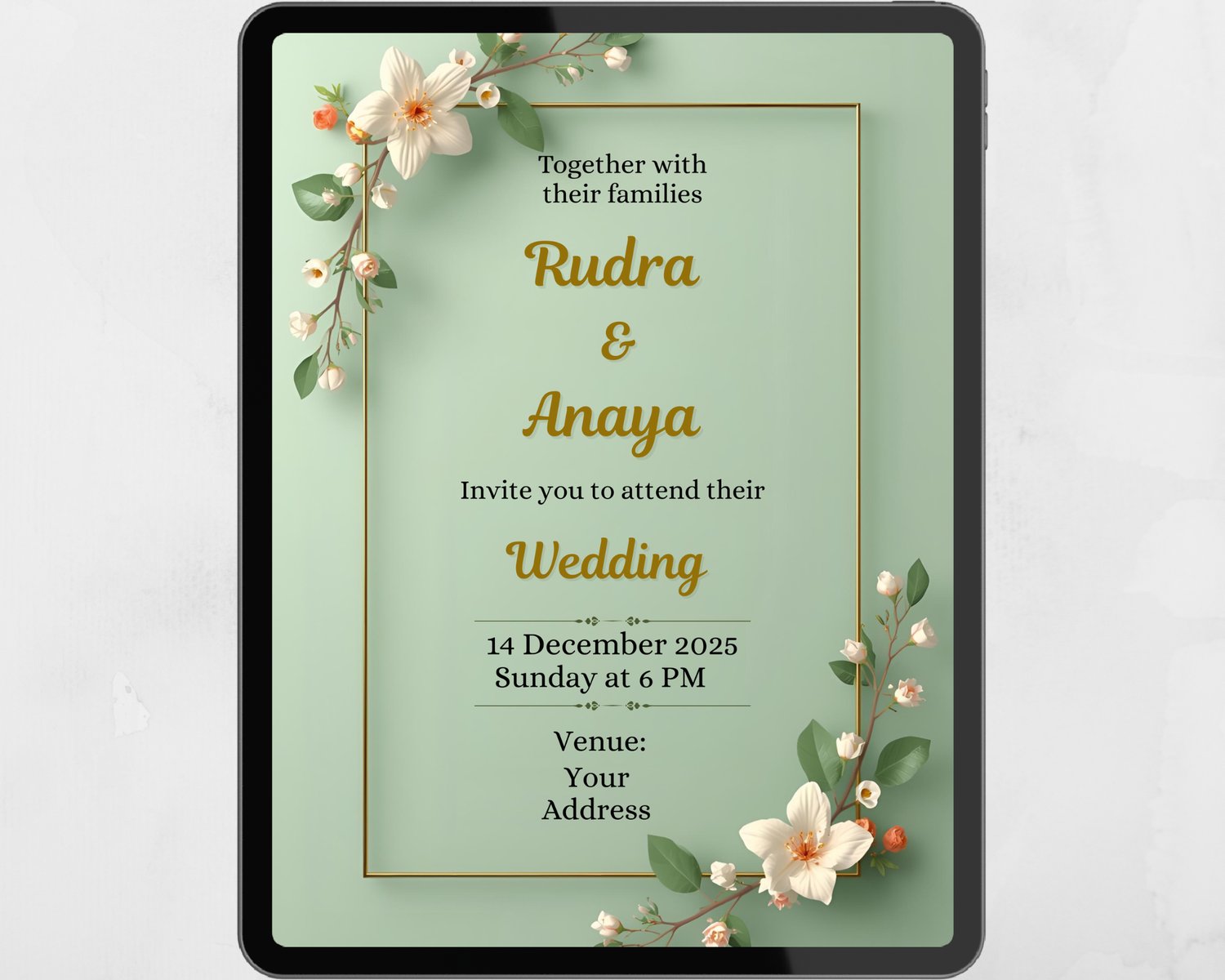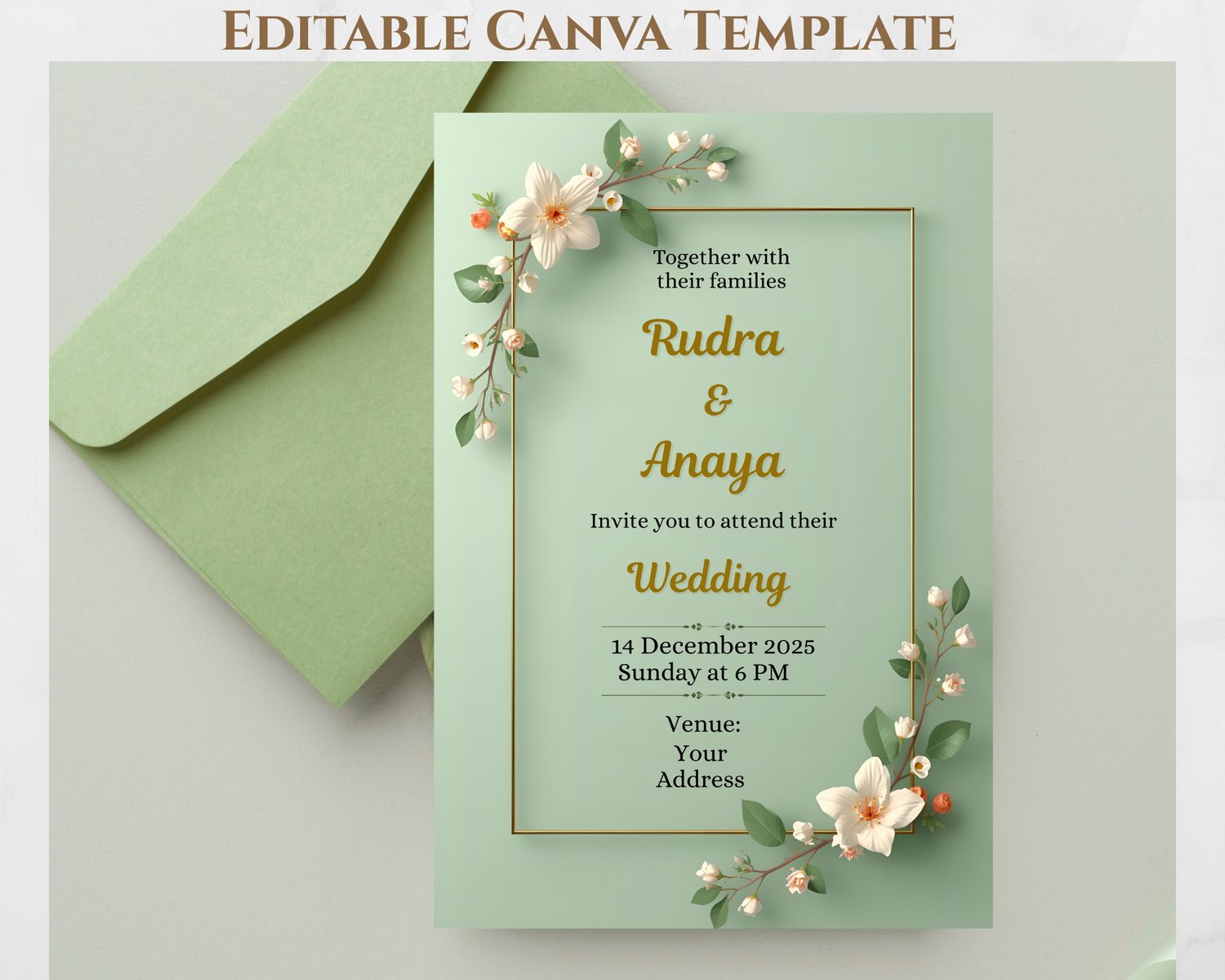 Bring timeless beauty to your wedding with this elegant sage green floral invitation. Designed with a delicate gold frame and soft blooming flowers, this template creates a modern yet romantic look for your celebration.