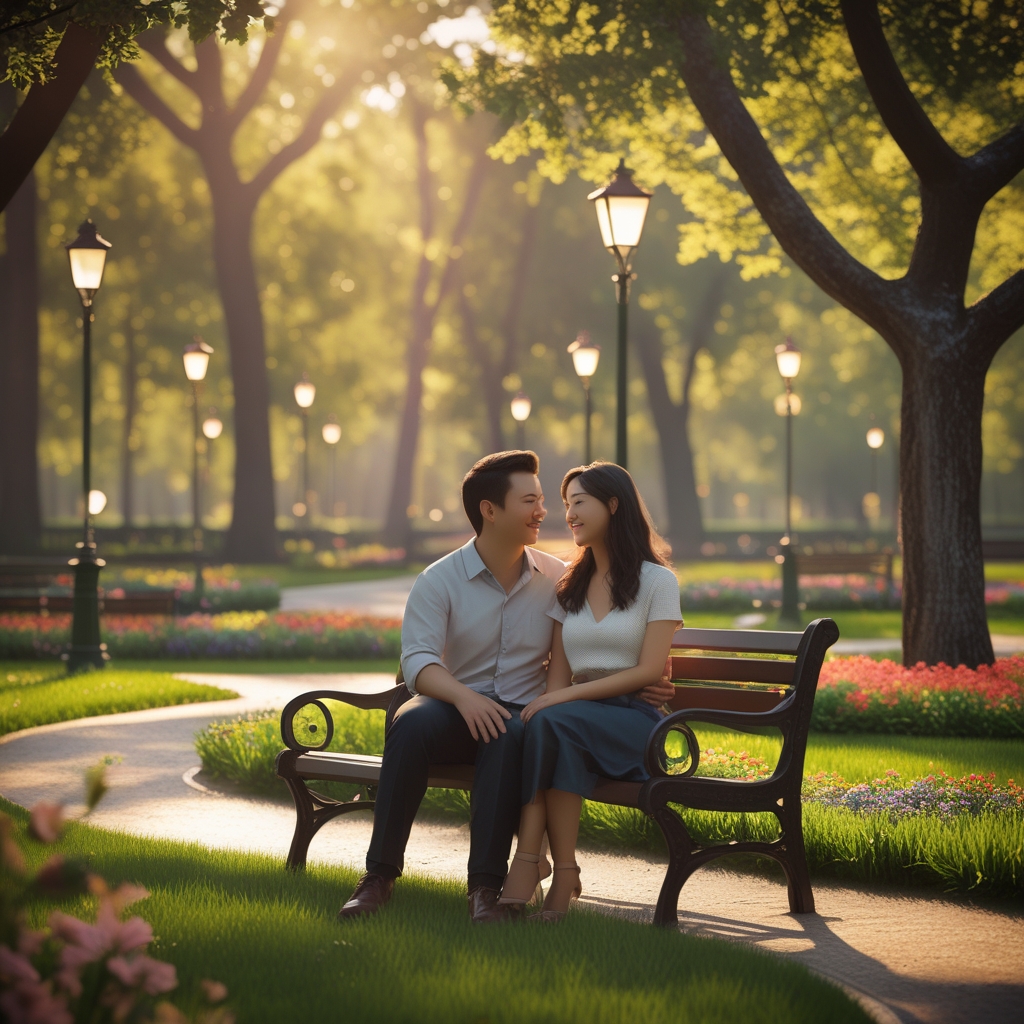 "A romantic couple sitting closely together on a wooden bench in a beautifully landscaped park during a warm afternoon. Sunlight filters through tall trees, casting dappled shadows on the lush green grass and colorful flowerbeds around them. A gentle pathway winds through the park, with decorative lampposts, benches, and a small fountain in the distance. The couple looks happy and relaxed, sharing a tender moment, with subtle expressions of love and warmth. Cinematic, photorealistic lighting, high-detail textures on clothing, skin, and natural surroundings, soft golden afternoon glow, peaceful and romantic atmosphere."