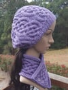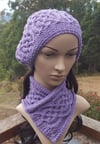 This set includes a cabled buttoned Neck Scarf and matching cabled slouchy Beanie.