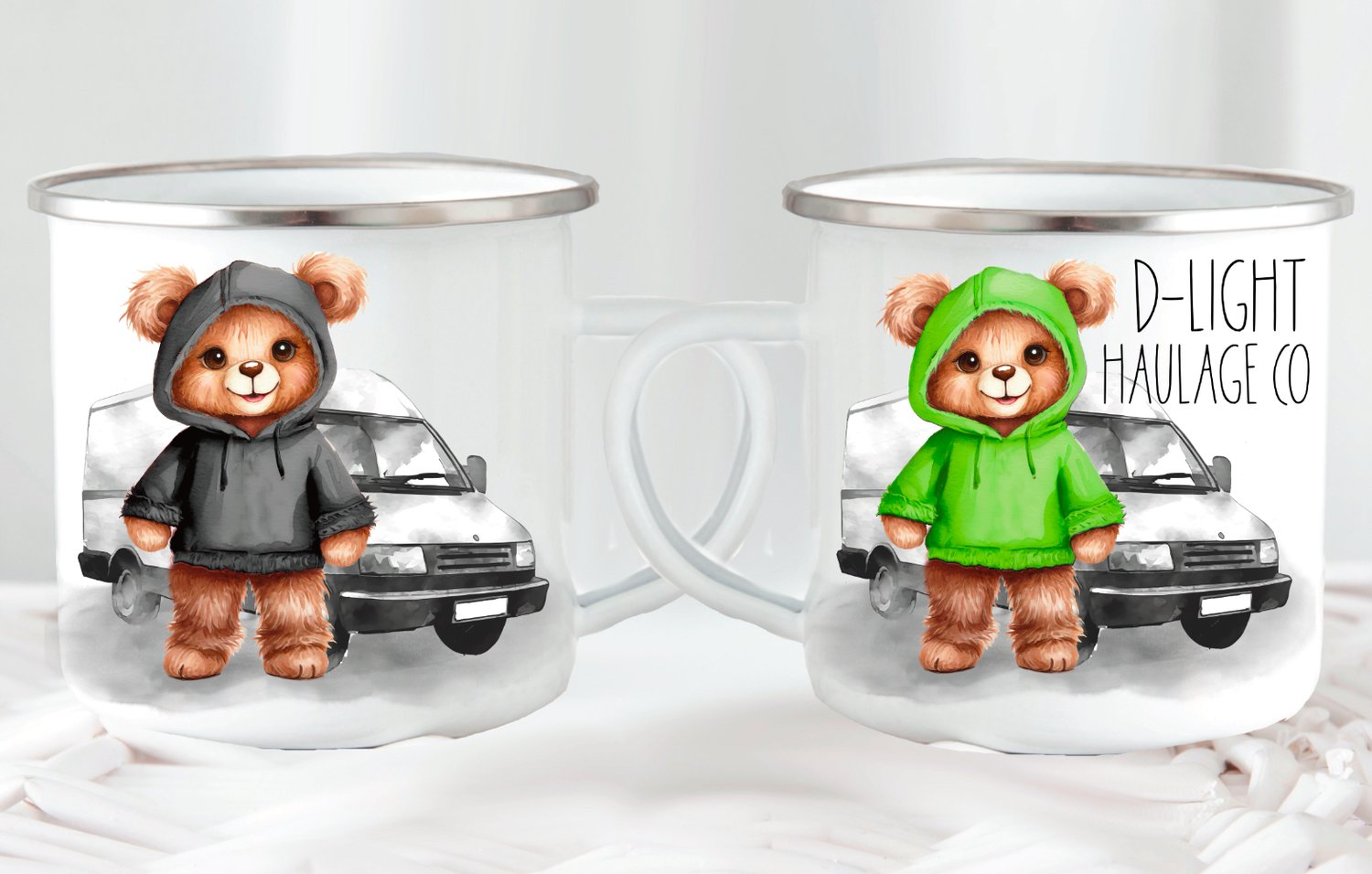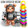 Cute teddy bear business logo, van driver, with van graphic and 12 hoodie clipart to mix and match. Sublimation, print, personalise. PNG.