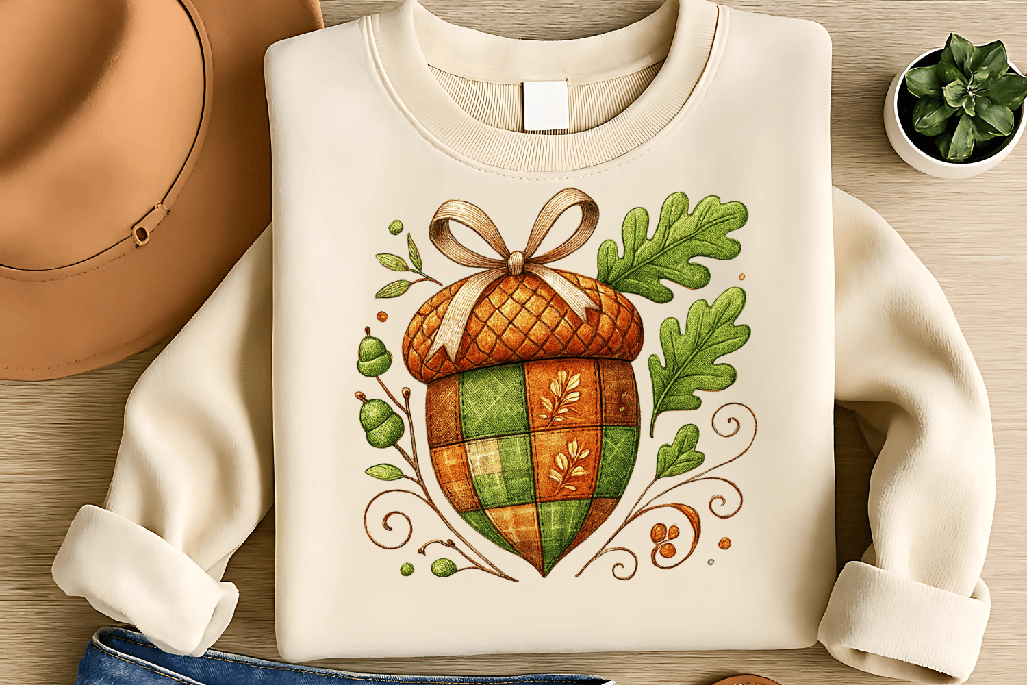Embroidered Patchwork Acorn Autumn Sublimation PNG – Cozy Fall Acorn Clipart for T-Shirts – Rustic & Textured Design – 300 DPI Instant Digital Download