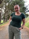 The Claudette Tee is a retro top, perfect for an elegant Spring or Summer look that you can wear out for a relaxed day at your favorite café or out on the boardwalk. You could wear it with a pair of high-waisted trousers or a skirt!