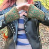 These wrist warmers are knitted bottom-up in the round, with thin bands of seed stitch from both bottom and top. The body of the wrist warmers is decorated with stranded colorwork. The pattern is offered in two sizes, with clear, complete instructions as well as links to captioned videos.