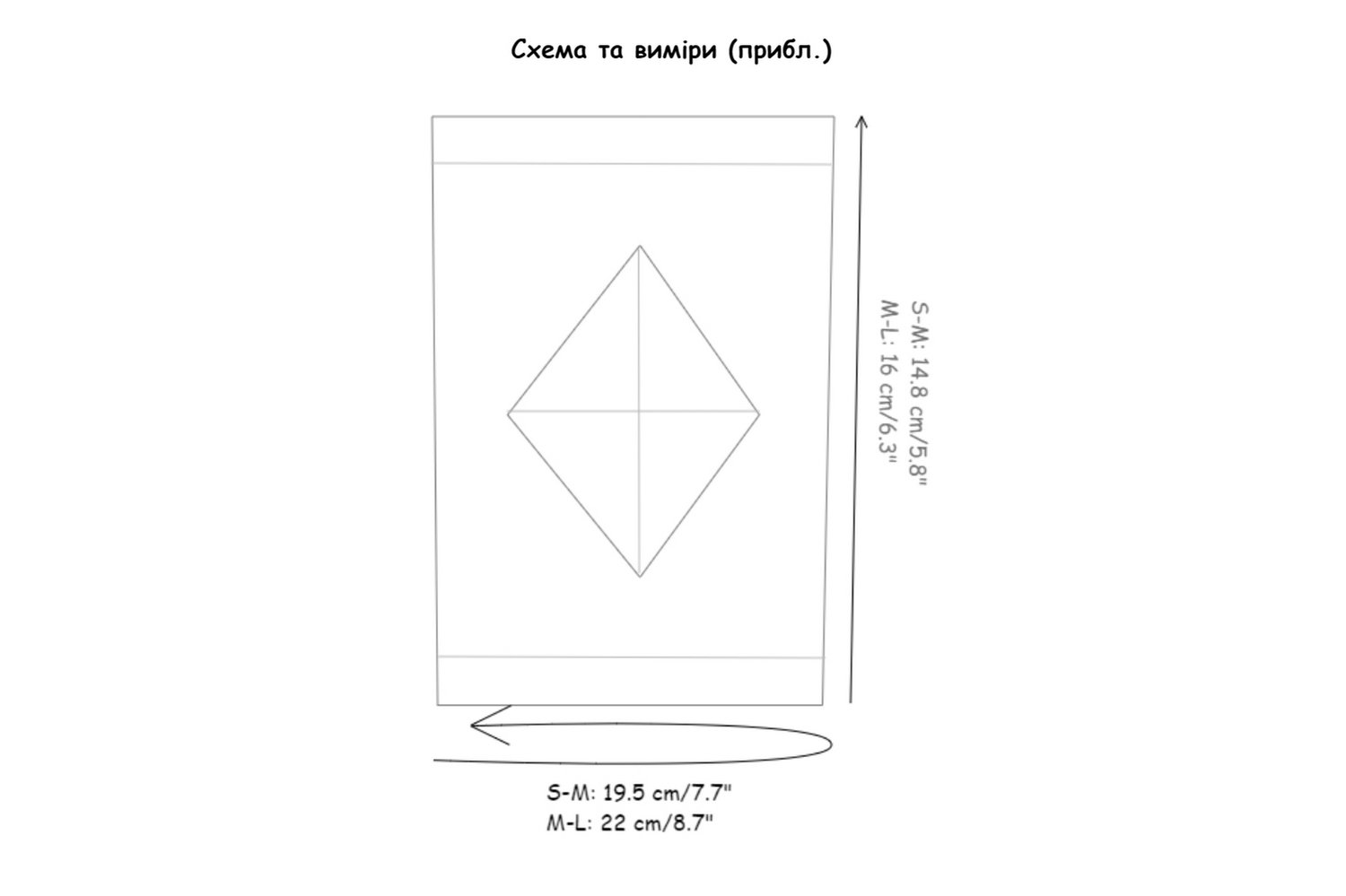 S-M: 19.5 cm/7.7” circumference. and 14.8 cm/5.8” length (works for palm circumference. 19.5-21.5 cm/ 7.7-8.5”)