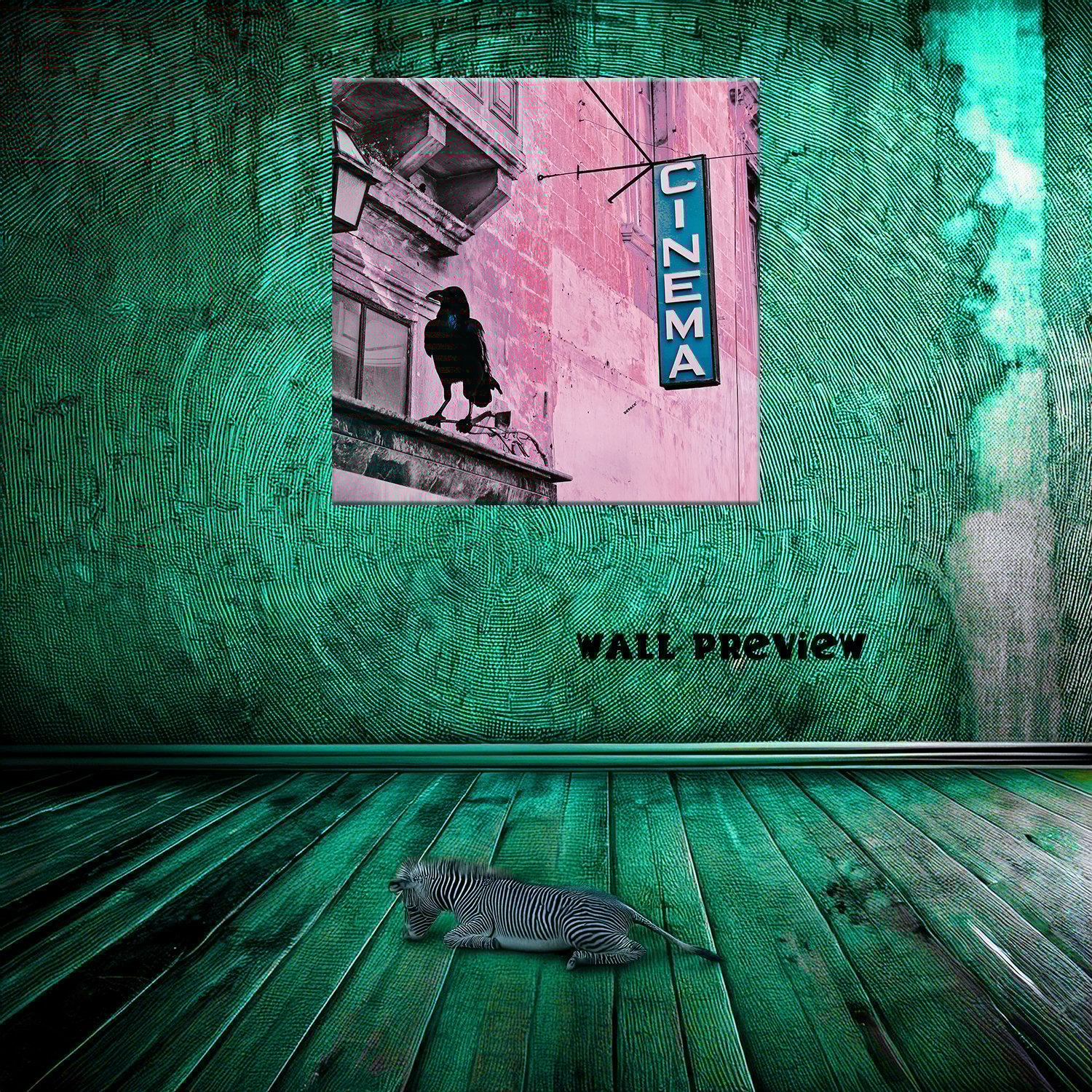 A weathered cinema sign clings to the side of an old concrete building, its faded letters whispering of forgotten shows—while a black raven perches on the windowsill, a lone witness to time, decay, and untold stories.
