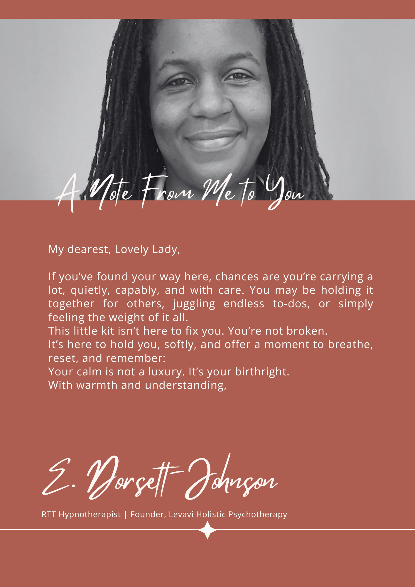 Designed by Eudie Dorsett-Johnson, Certified RTT Hypnotherapist and founder of Levavi Holistic Psychotherapy, this resource offers quick, calm tools, grounding techniques, gentle affirmations, and reflective prompts that can be used in real time, between meetings, before a difficult conversation, or on days that just feel heavy.