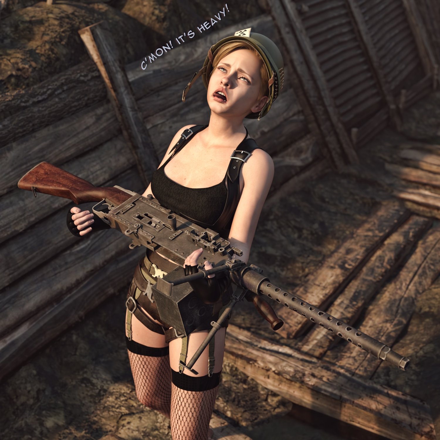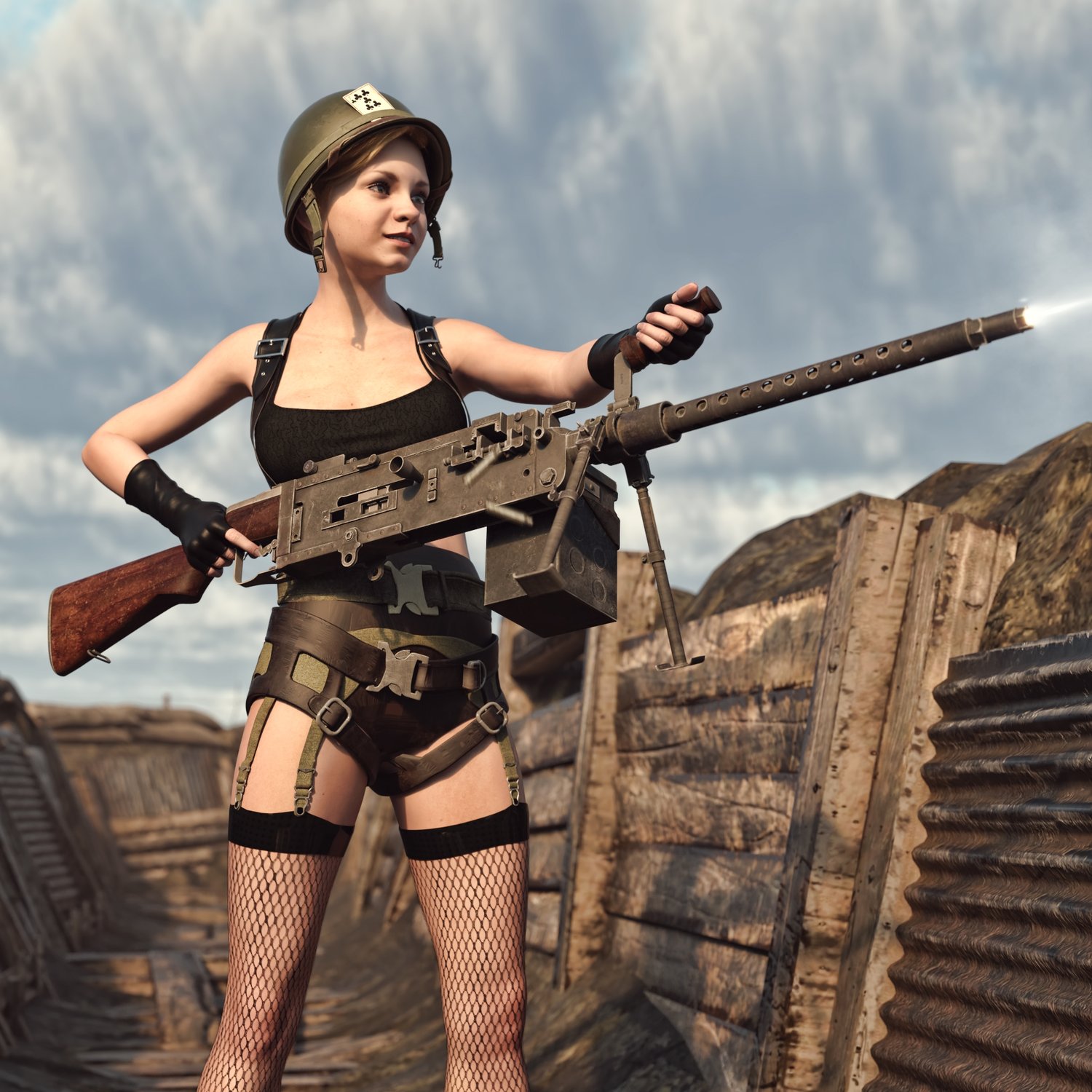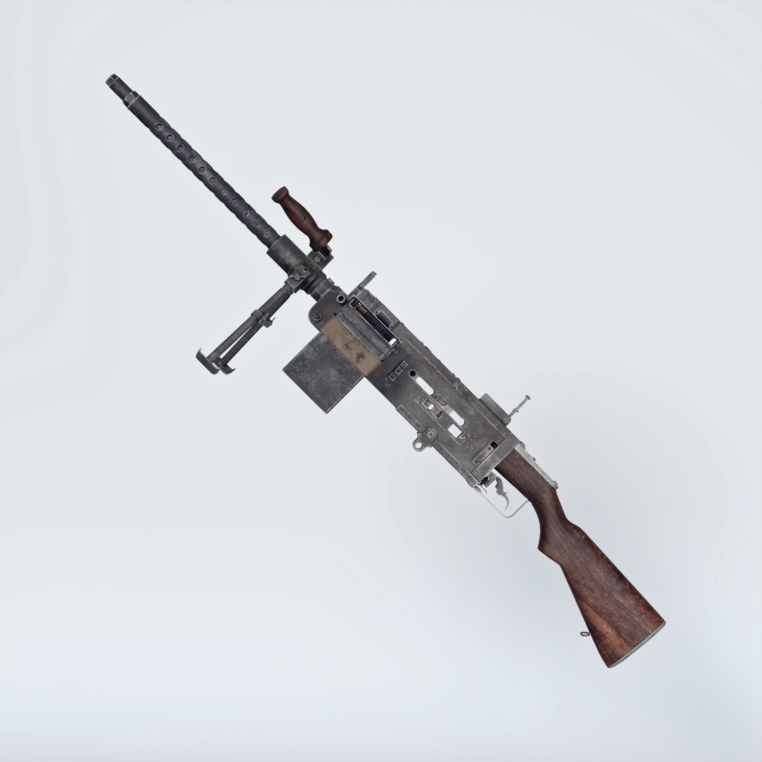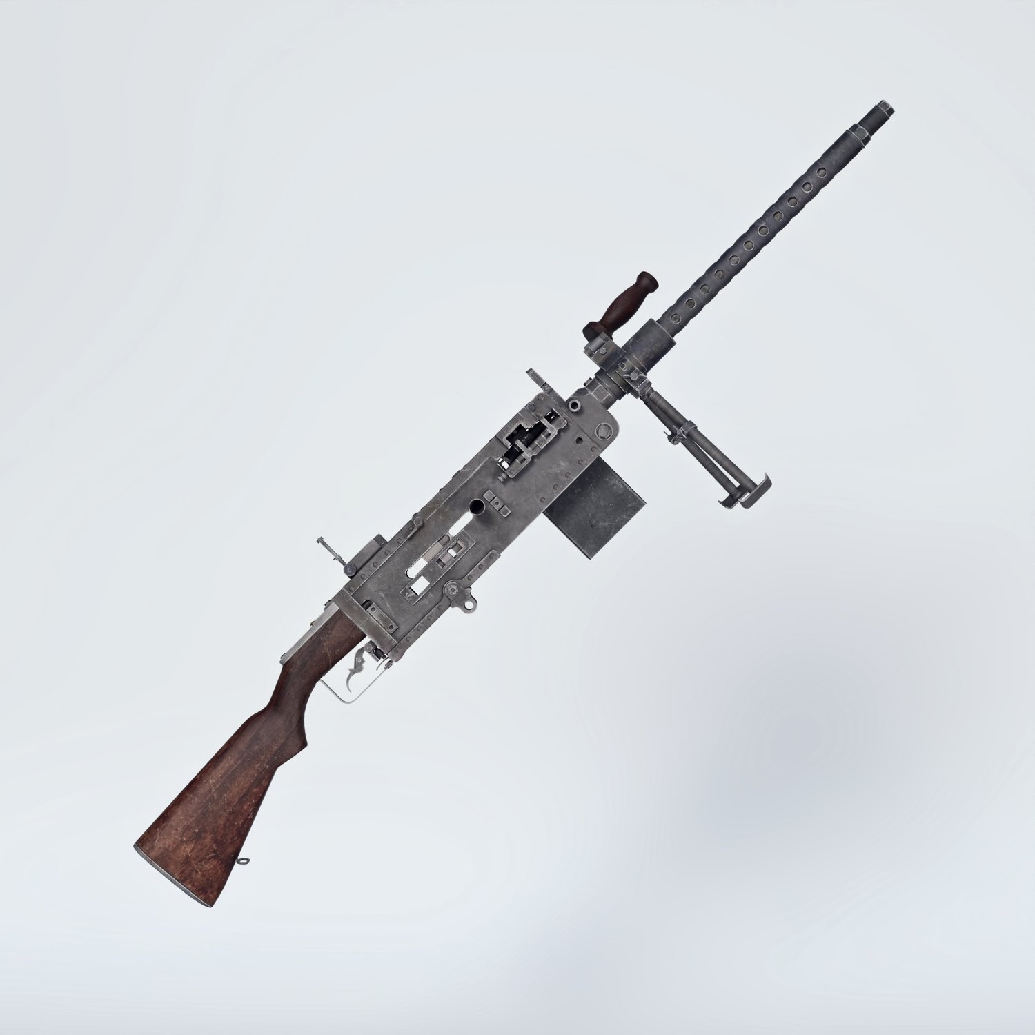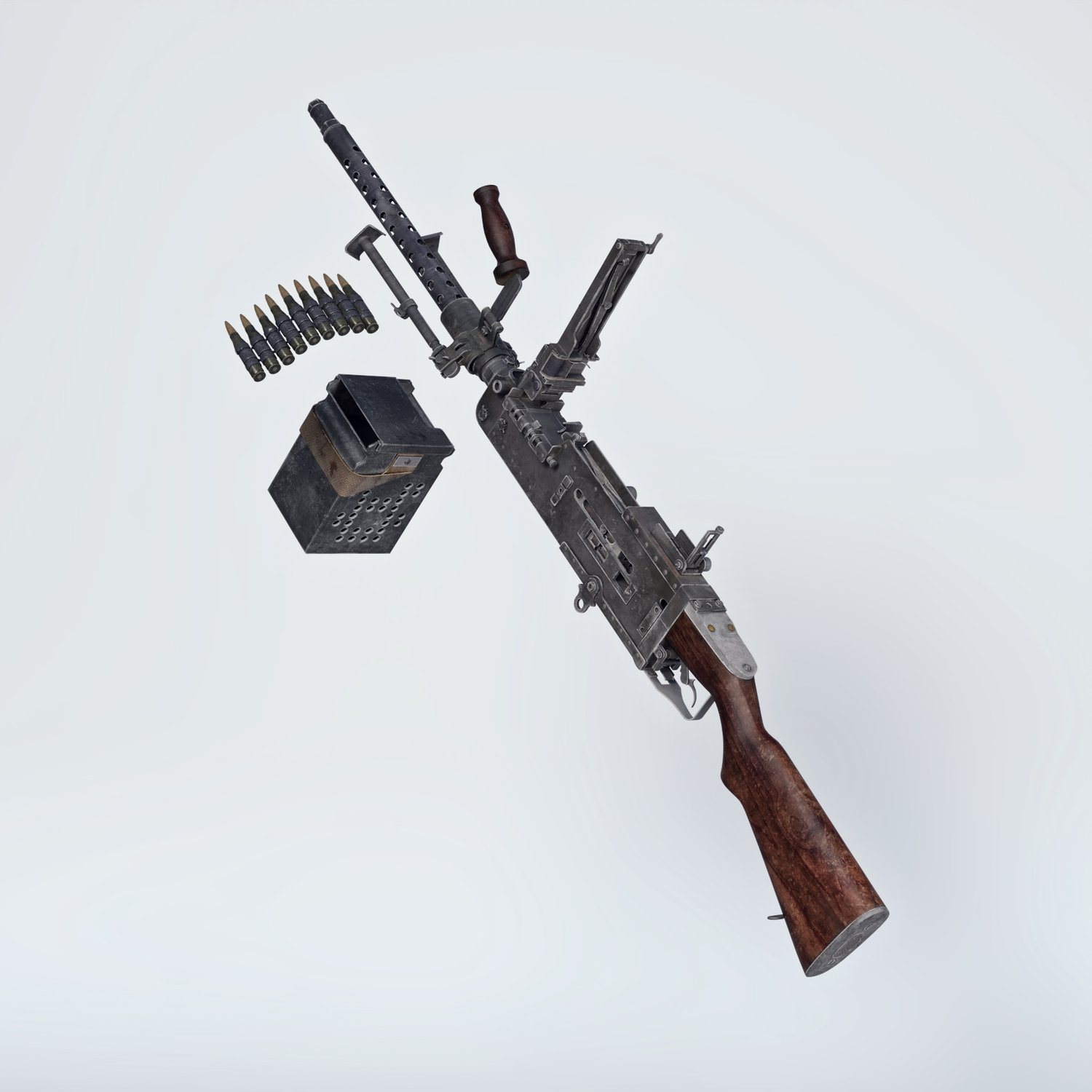An experimental modification of a .30 caliber WW2 Browning machine gun. Fitted with a different carry handle, a stock and a modified trigger, intended to be used hand held and on the move. Used in small numbers in the pacific theatre of WW2, but didn't see a wide use. Converted and rigged for use with DAZ. Trigger, bipod, bolt cover etc also rigged for more realistic pictures. Includes an ammo box and belt. carry handle is also rigged.