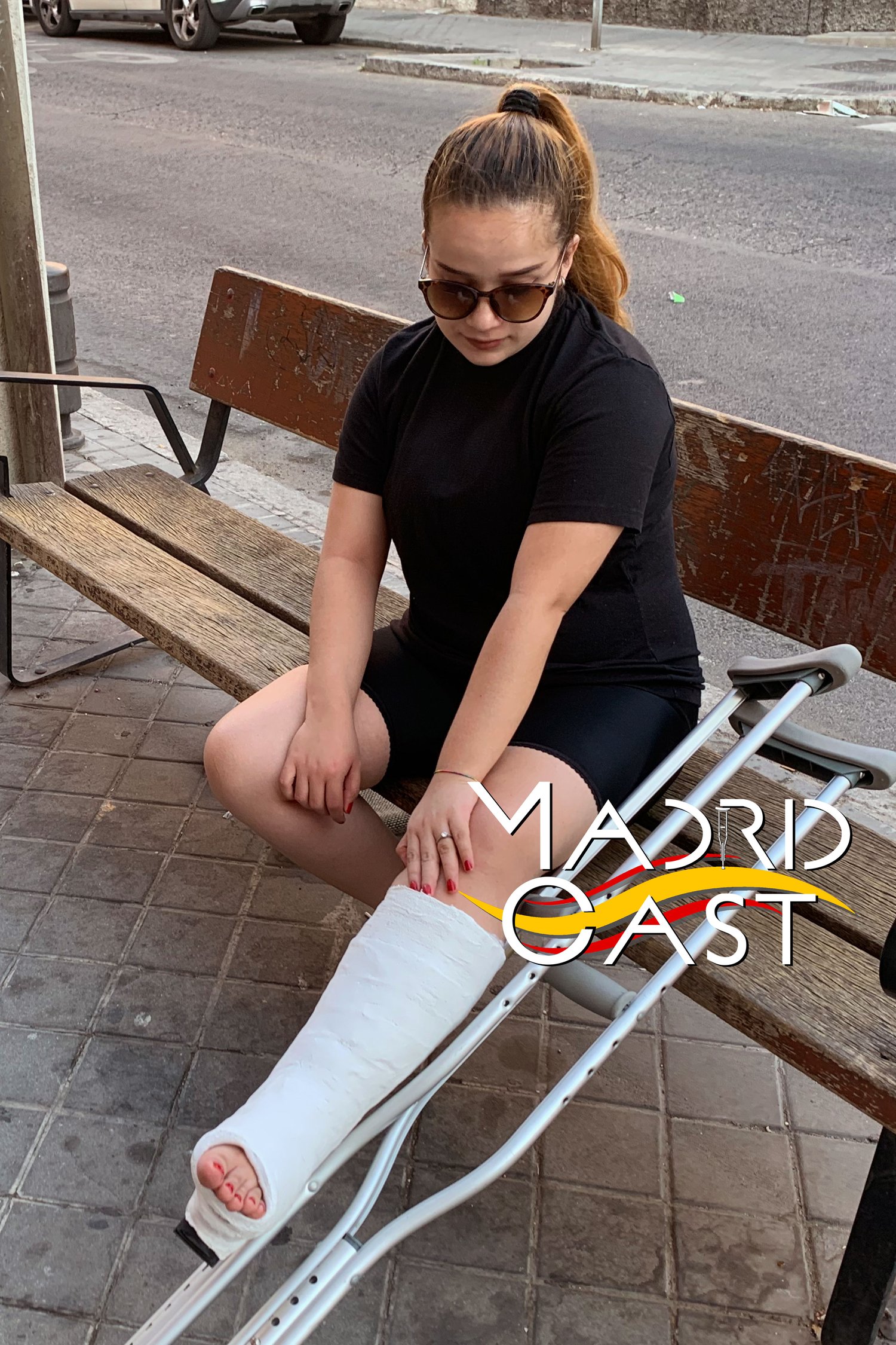Ella camina con muletas por la calle yendo hacia la parada de autobuses para sentarse un rato y limpiar sus dedos del pie enyesado.