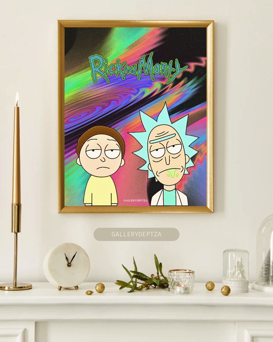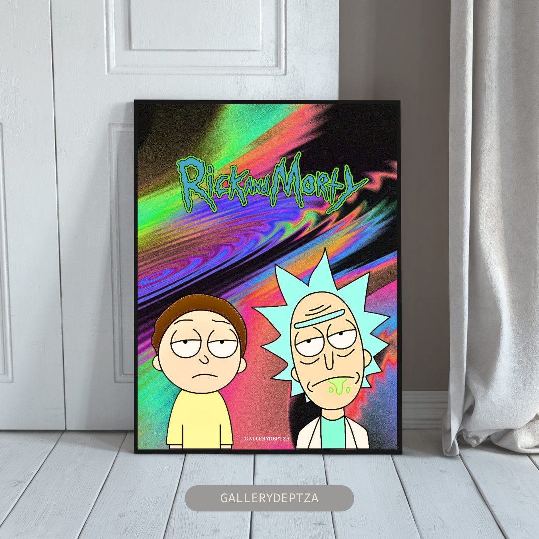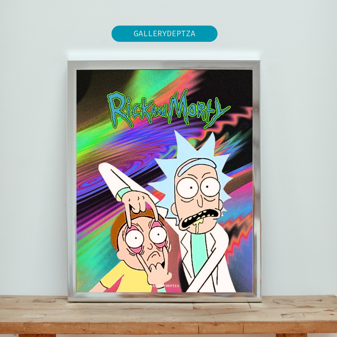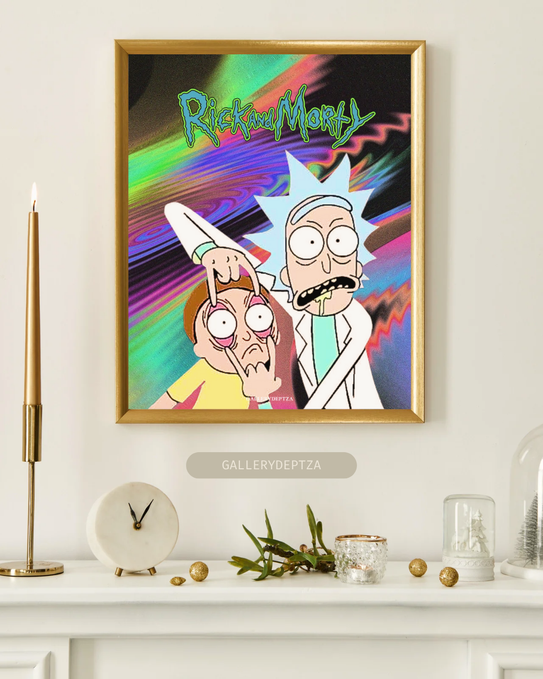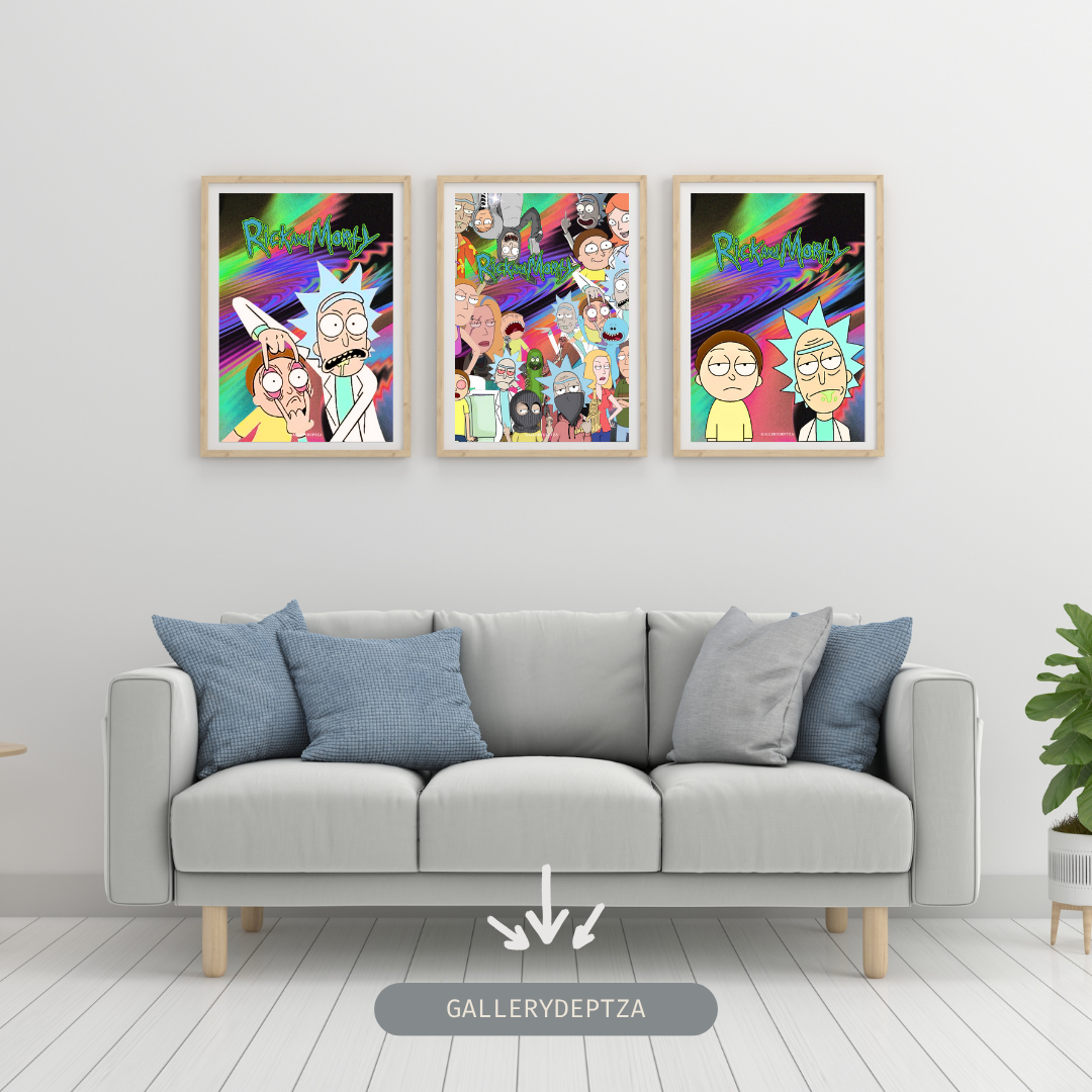 This 3-pack of trippy digital posters captures the chaos, color, and cosmic madness of everyone’s favorite interdimensional duo. Each piece blends animated energy with surreal, psychedelic vibes that make your walls scream "existence is pain... but make it aesthetic."