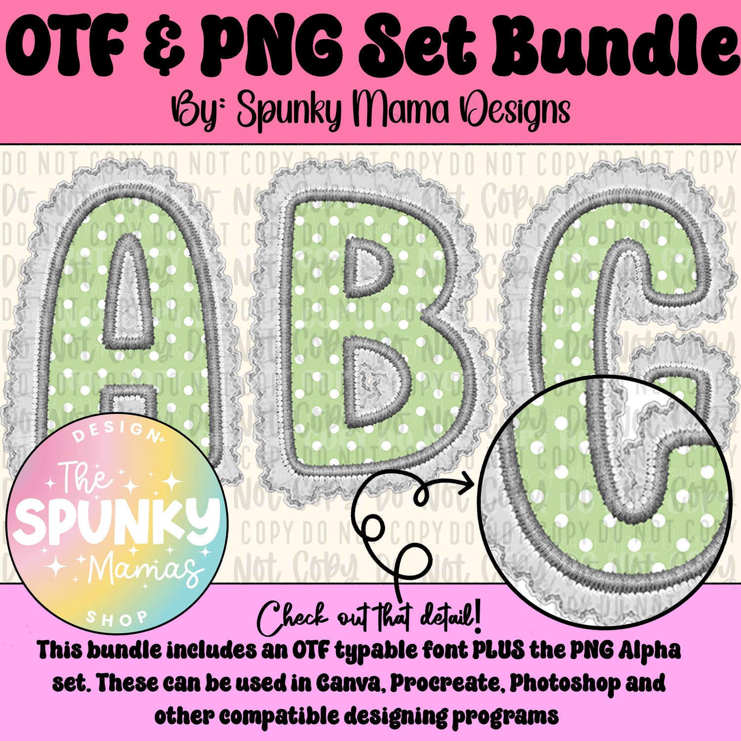 Vintage Granny Green Polka Dots OTF Font & Digital PNG Alpha Set