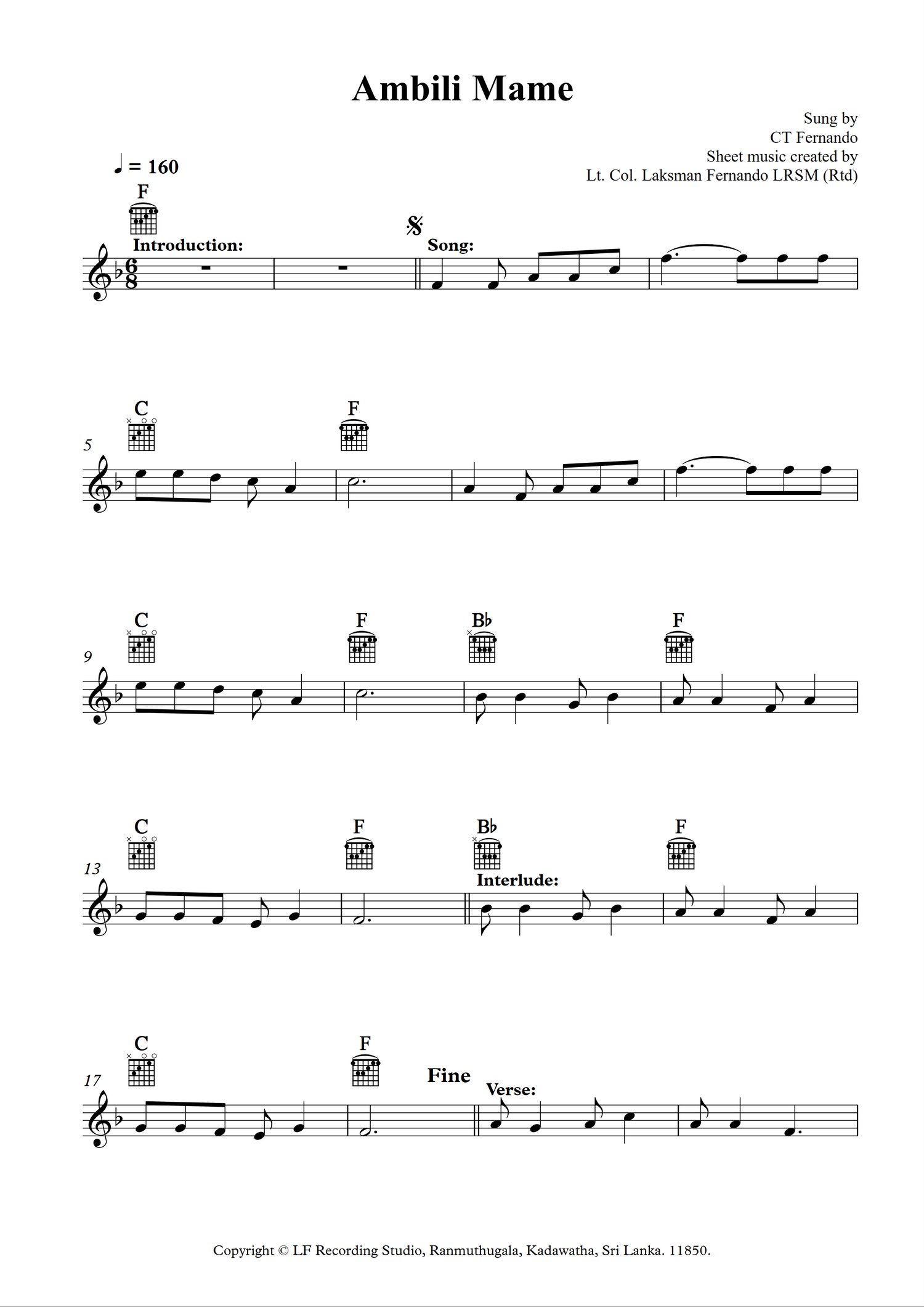 Sheet Music created by Lt. Col. Laksman Fernando LRSM (Rtd).