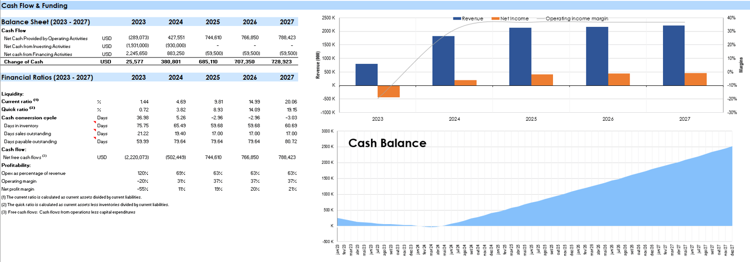 These output sheets offer users a comprehensive analysis of financial projections, including revenue growth, gross margin, and net profit margin. Furthermore, the model provides a vast selection of charts and ratios that offer a deeper understanding of the business's performance drivers.