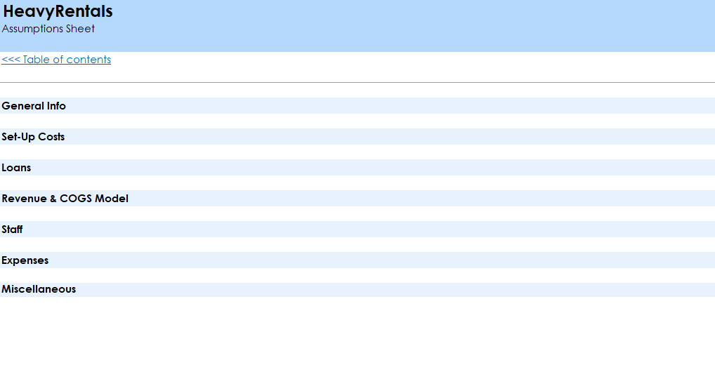 Investments: Forecasting balance sheet transactions for equipment rental investment can be daunting for those new to forecasting. However, the model takes a simple approach by allowing users to set the percentage of funds from loans, cash, or business equity in the assumptions sheet. This feature provides flexibility, enabling users to set up funding processes (loan or equity) for each rental equipment.