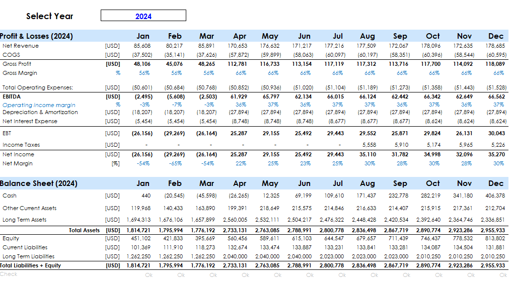 The financial model is that most inputs are set in the assumption sheets. These inputs include revenue assumptions, capital expenditures, operating expenses, startup costs, and other critical financial data. This user-friendly interface allows users to input data in the blue font cells while the rest of the model uses formulas or labels.