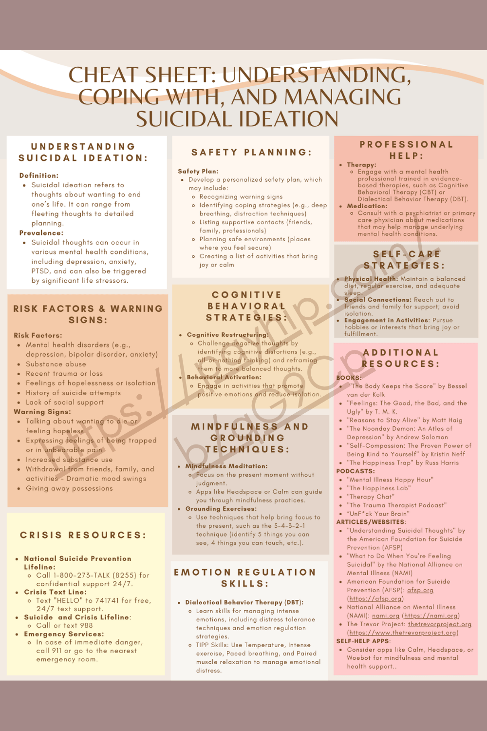 Understanding, coping with and managing suicidal ideation is a complex and deeply personal journey. While it's essential to seek help and support from professionals, friends, and family, this cheat sheet provides useful information and evidence-based tools for additional support.