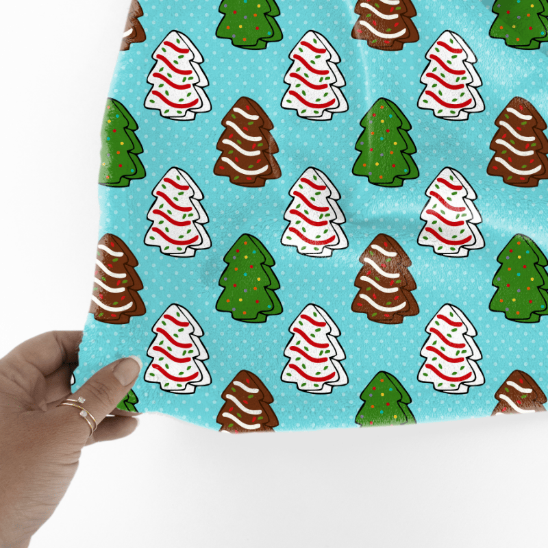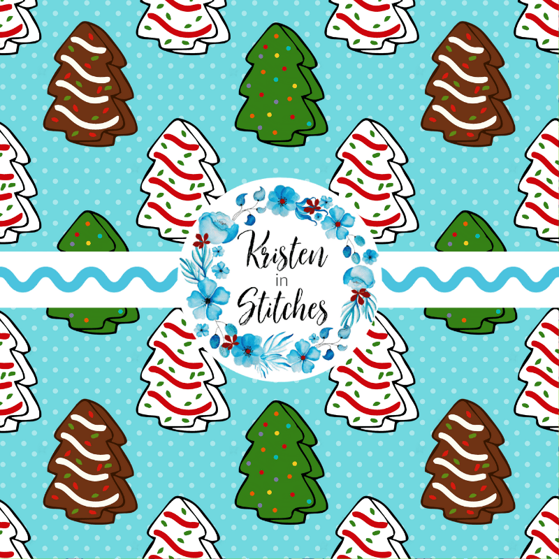 It's Debbie cake season! Frosted Christmas tree snack cakes on blue.