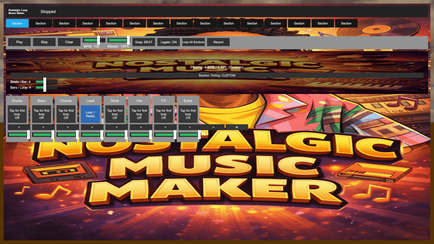Nostalgic Loop Music Maker is a Unity-based loop performance and arrangement tool designed to let you build music by combining repeating audio clips on multiple channels. It behaves more like a hybrid of a live looper, arrangement sketchpad, and performance launcher than a traditional timeline sequencer.