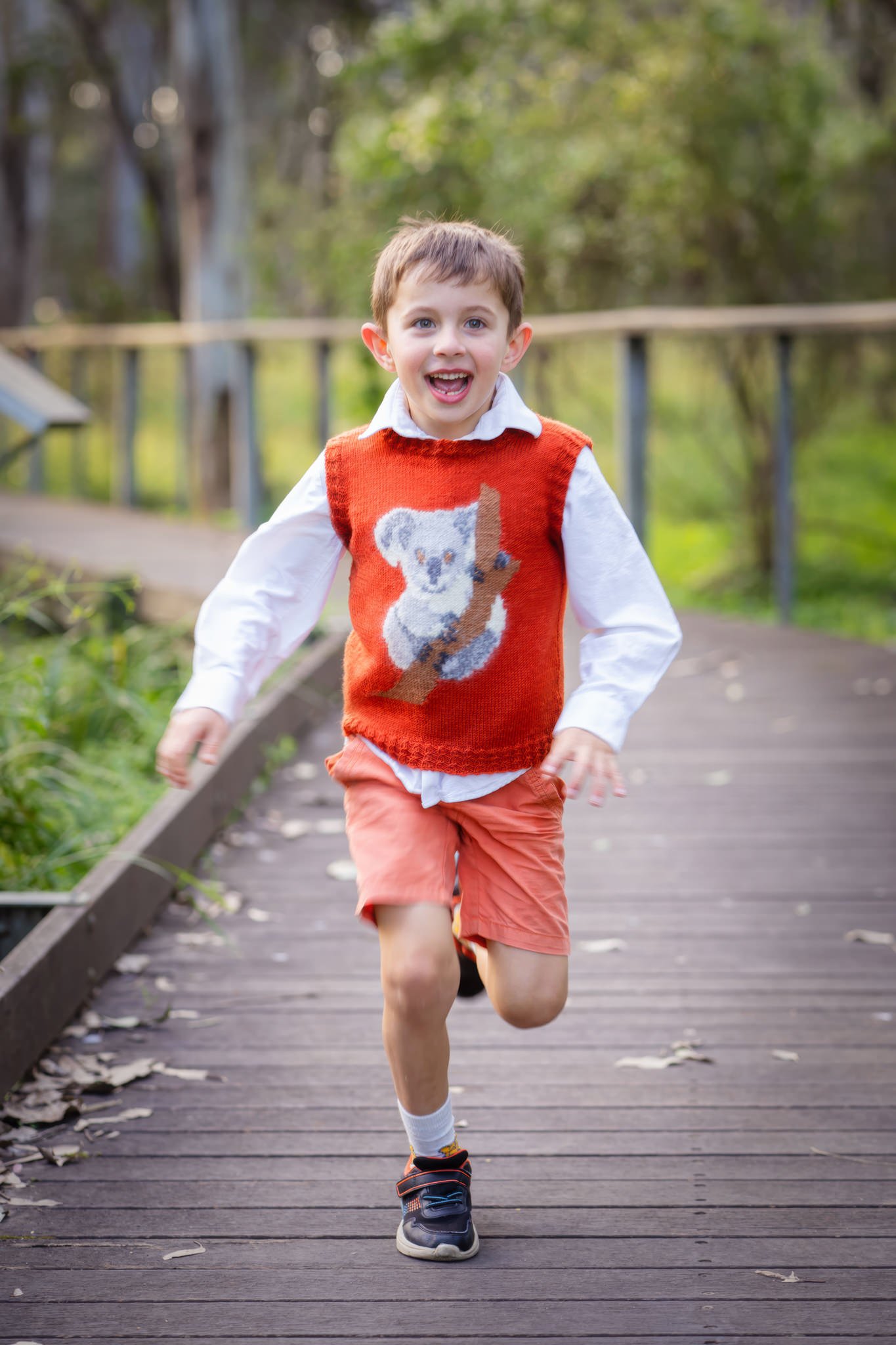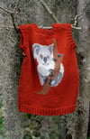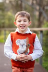 The Koala Kid Vest pattern is a unisex close-fitting sleeveless vest knitted back and forth in stocking stitch with an intarsia image on the front, bindings for the neck and armholes. Basic chart reading and a small amount of sewing is required. Full written instructions for the charts are included. The complete pattern is written for 4ply fingering weight and for 8ply DK weight.