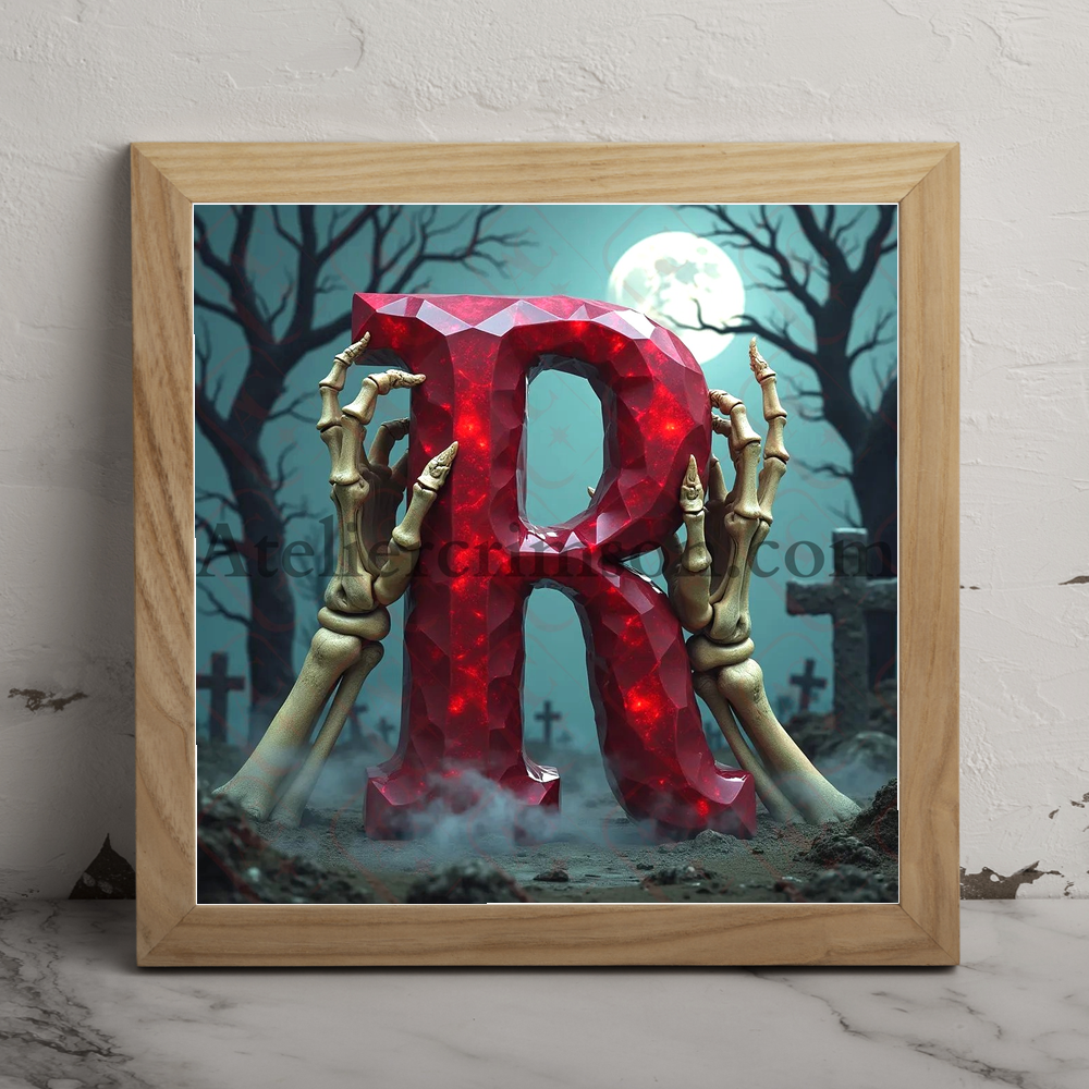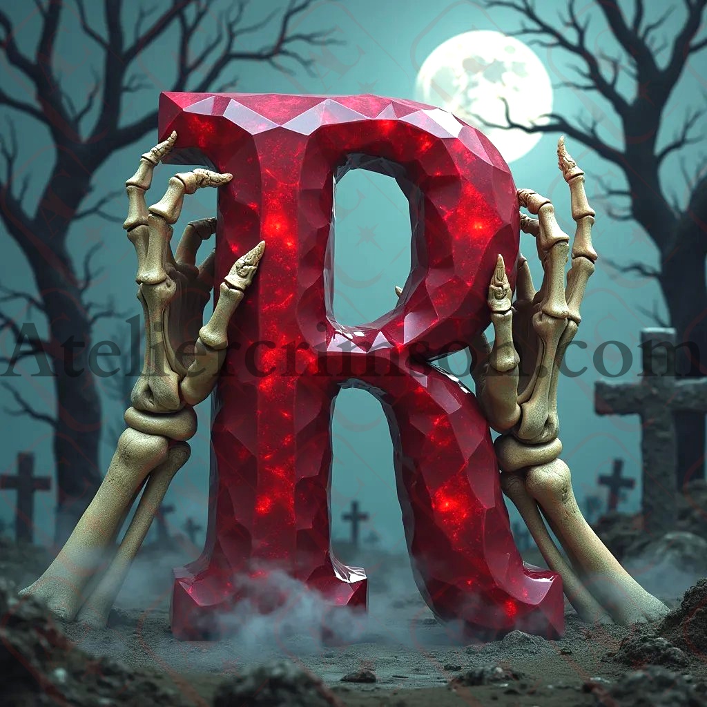 The letter R ruby halloween skull Discover our eerie alphabet series featuring photorealistic ruby letters and numbers. Each character, crafted from deep red gemstone, floats mysteriously in a misty graveyard. Skeletal hands frame these gleaming symbols against a moonlit, Halloween-inspired backdrop. Perfect for gothic design projects or seasonal decor inspiration!