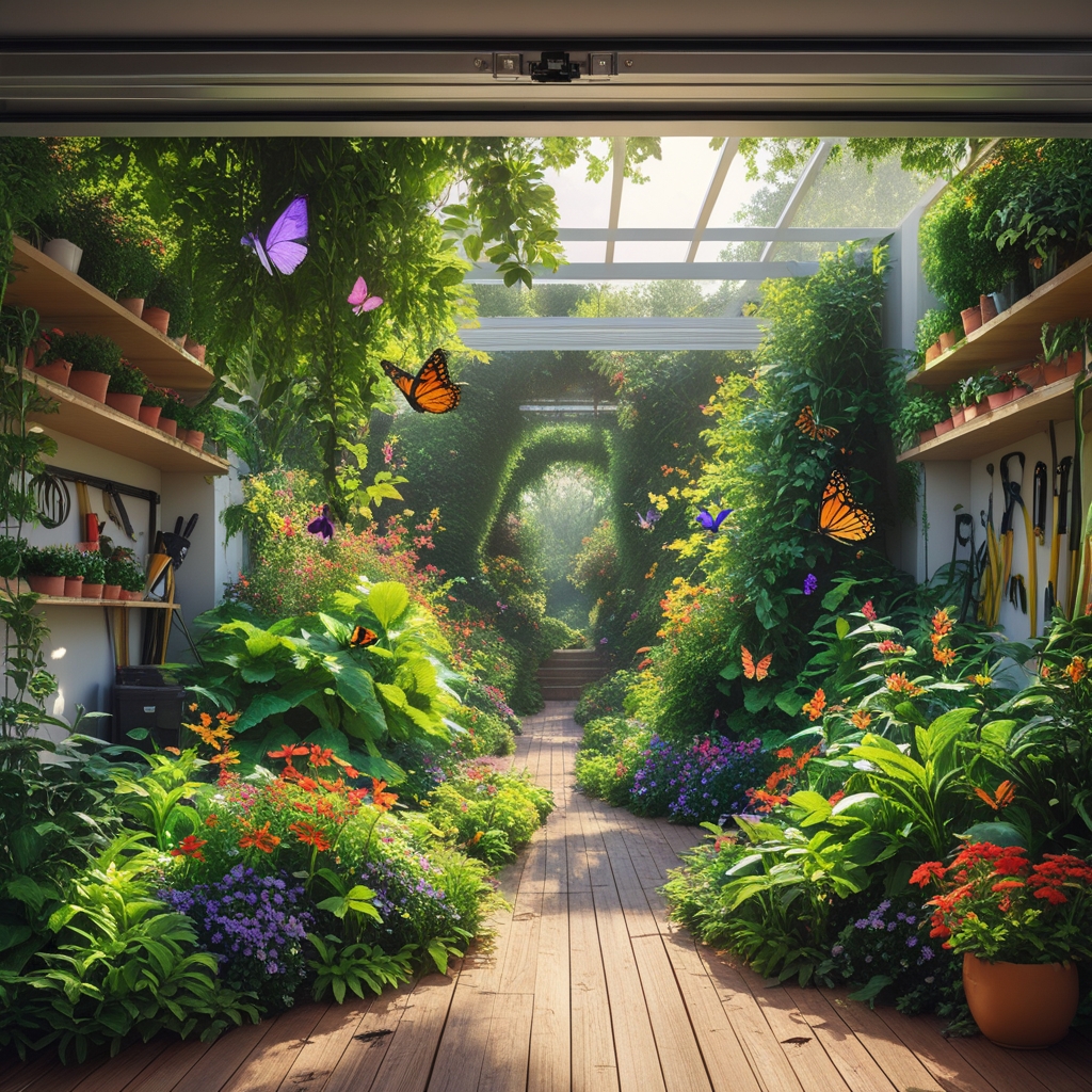 "A beautiful, lush garden overflowing with vibrant flowers, leafy plants, and winding pathways, viewed from inside a spacious, open garage. Sunlight streams in, illuminating the greenery, and a variety of insects—like butterflies, ladybugs, bees, and dragonflies—flutter and crawl among the plants and flowers. The garage has a clean, modern design with tools neatly arranged, potted plants on shelves, and a rustic wooden floor that blends seamlessly with the garden outside. The scene feels alive, peaceful, and full of natural beauty, capturing the harmony between the indoor garage space and the thriving outdoor garden."
