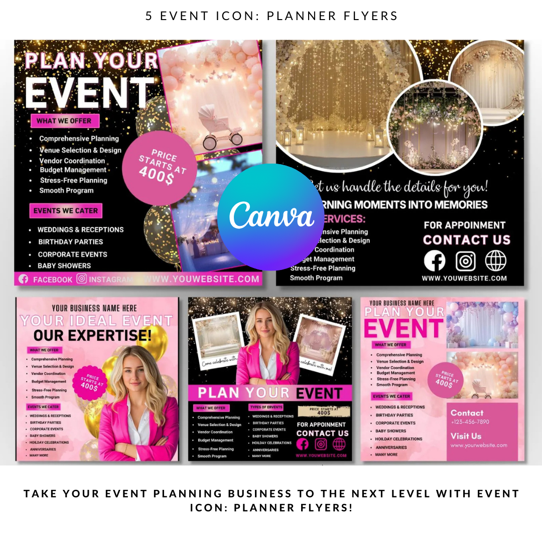 Take your event planning business to the next level with EVENT ICON: Planner Flyers! This set of 5 fully editable Canva flyers is perfect for promoting your services, packages, and special offers. Each design is bold, professional, and trendy made to attract attention and book clients fast.