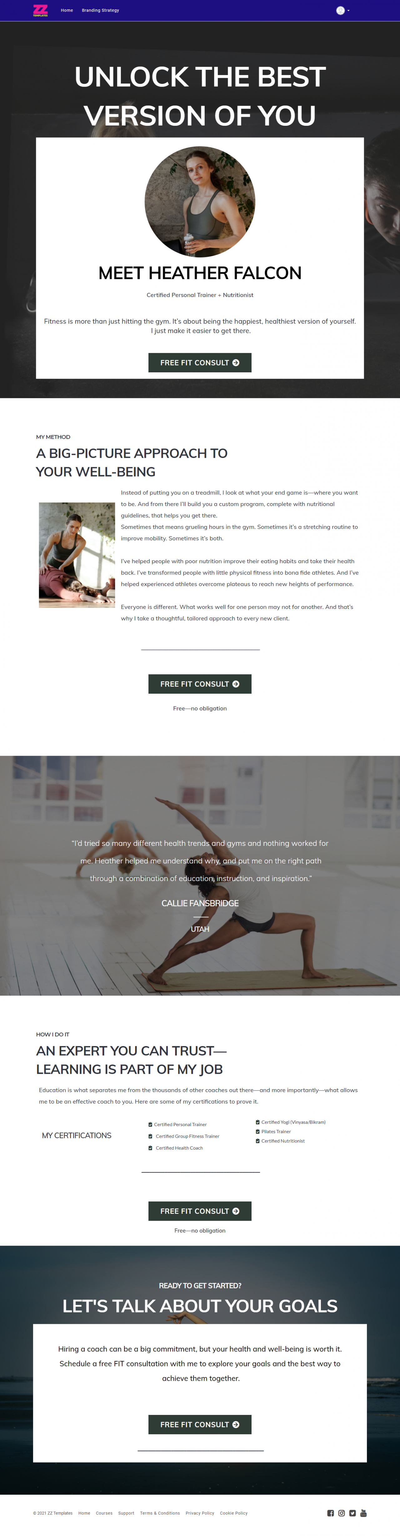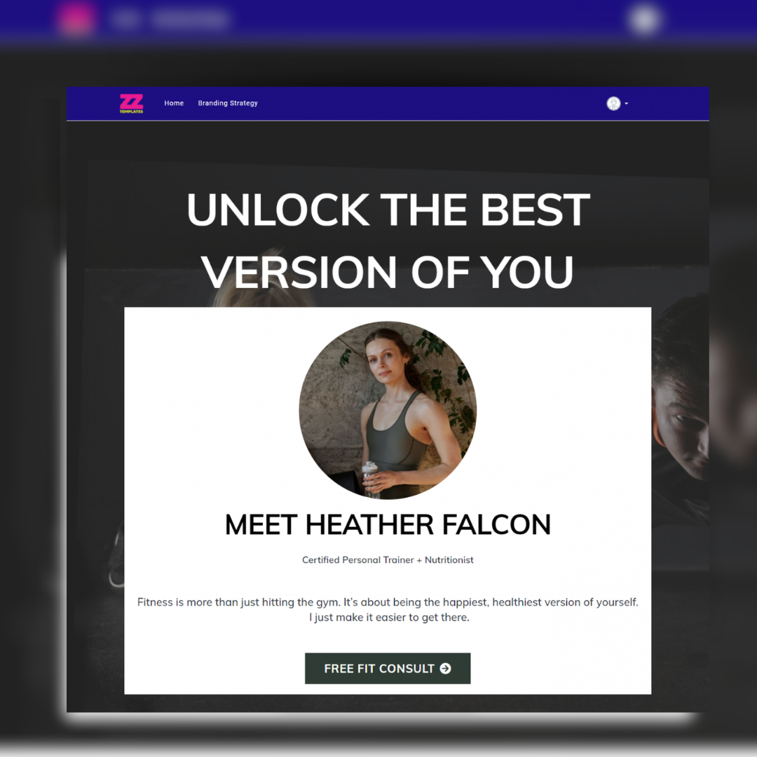 Unlock your best self with our Personal Trainer Landing Page template. Featuring certified personal trainer Heather Falcon, this template highlights a holistic approach to well-being with personalized fitness and nutrition plans.