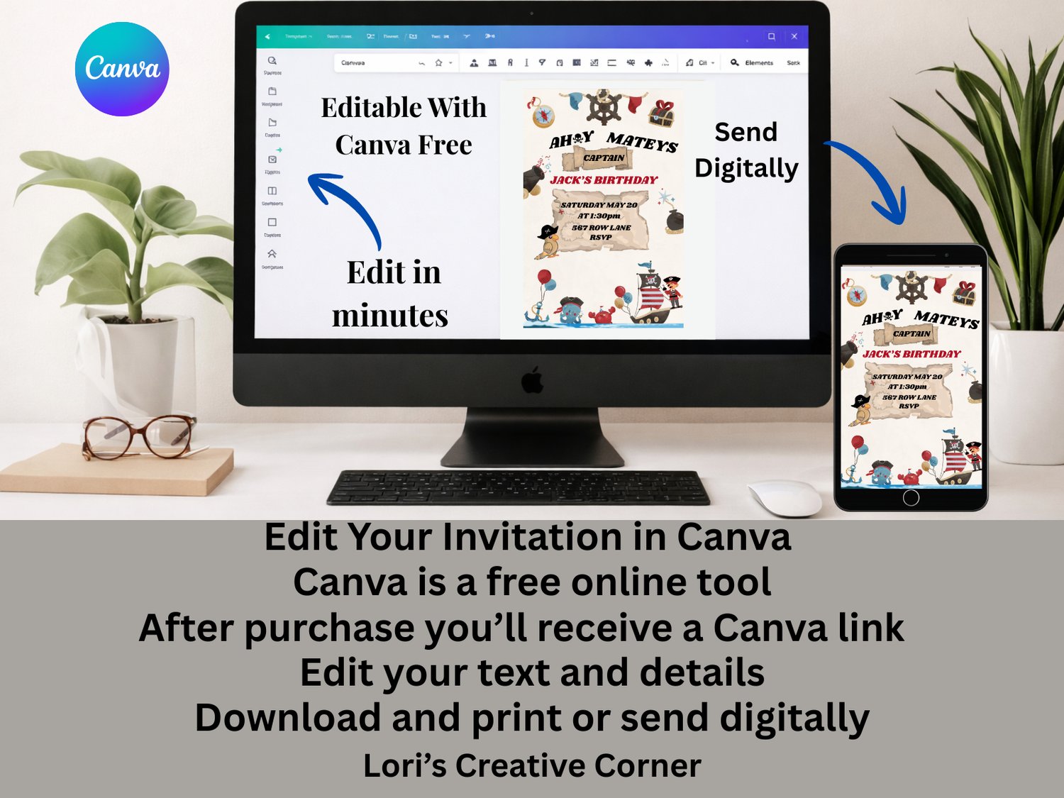 Looking for a birthday invitation that sparks adventure and excitement? This Pirate Birthday Invitation is perfect for young buccaneers! Featuring pirate ships, treasure maps, and adorable pirate characters, this editable 5x7 Canva template makes it easy to create a fun, personalized invite that will get your guests excited for the party. Download instantly, customize in Canva, and print at home or send digitally β no stress, no generic cards, and no last-minute trips to the store.