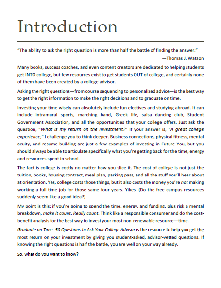 Whether it is your first year in college, or your last student to leave home, Graduate on Time; 50 Questions to Ask Your College Advisor is the helpful guide you’ve been missing.