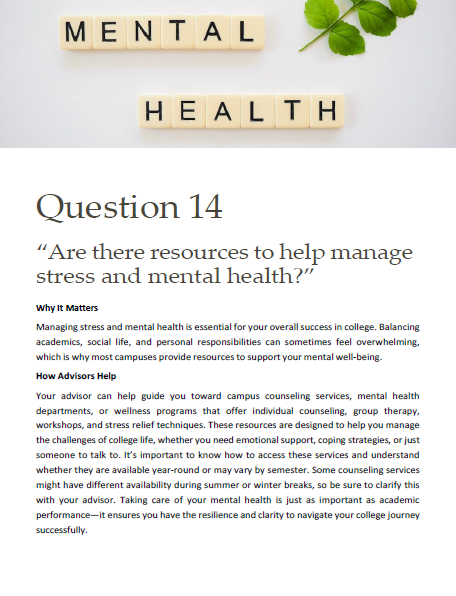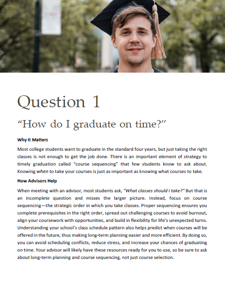 Each question includes why the question is valuable and what students should expect from their advisor, no matter the college or university.