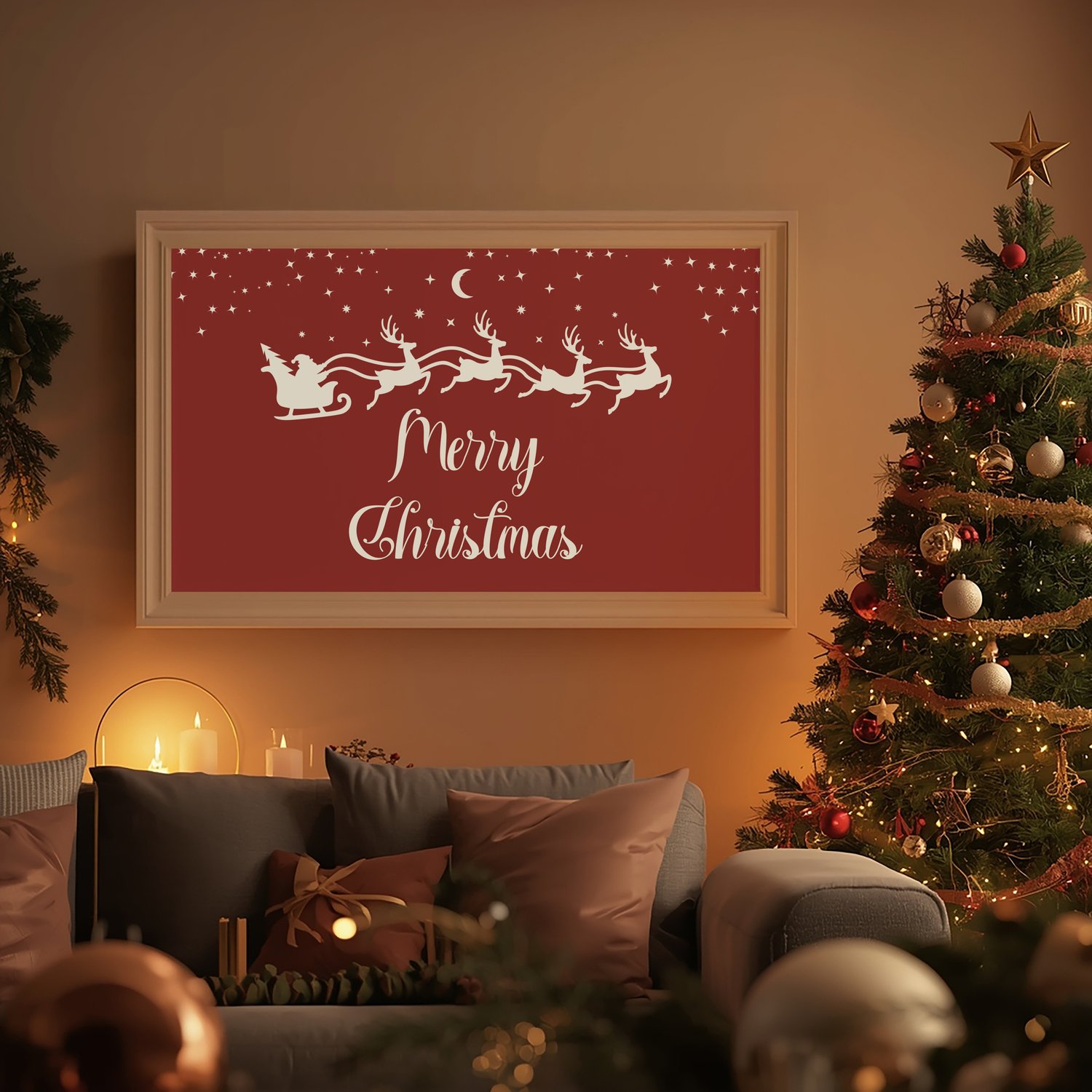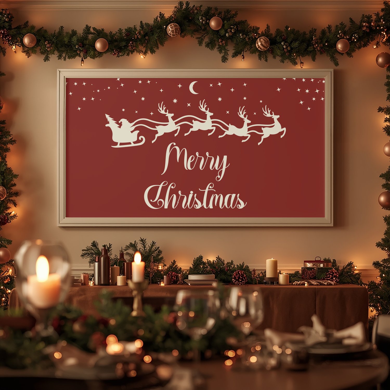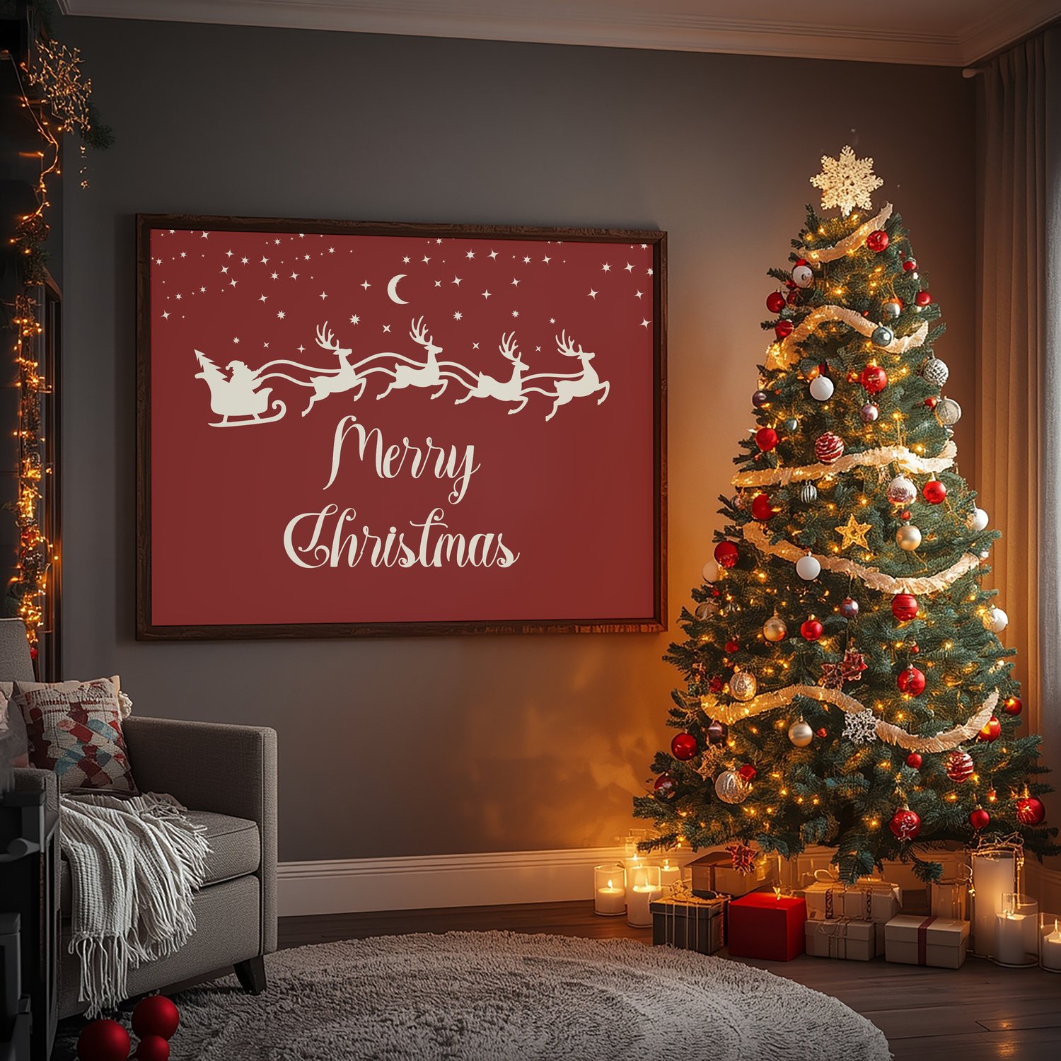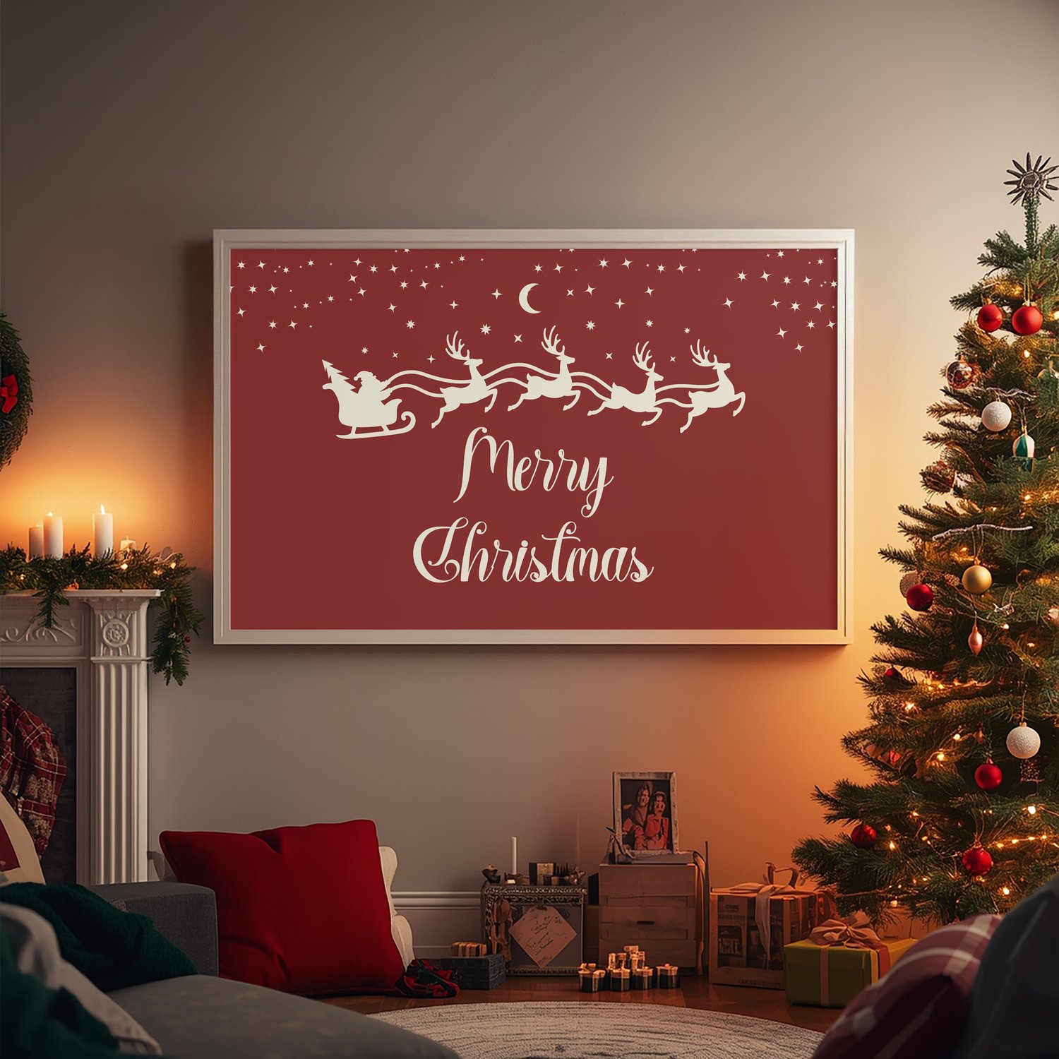 Bring timeless Christmas magic into your home with this beautiful vintage Santa sleigh wall art printable. Designed in a rich holiday red with elegant script and a charming silhouette of Santa and his reindeer, this artwork adds a warm, classic touch to your Christmas décor. Perfect for above the fireplace, living room, entryway, or dining room displays.