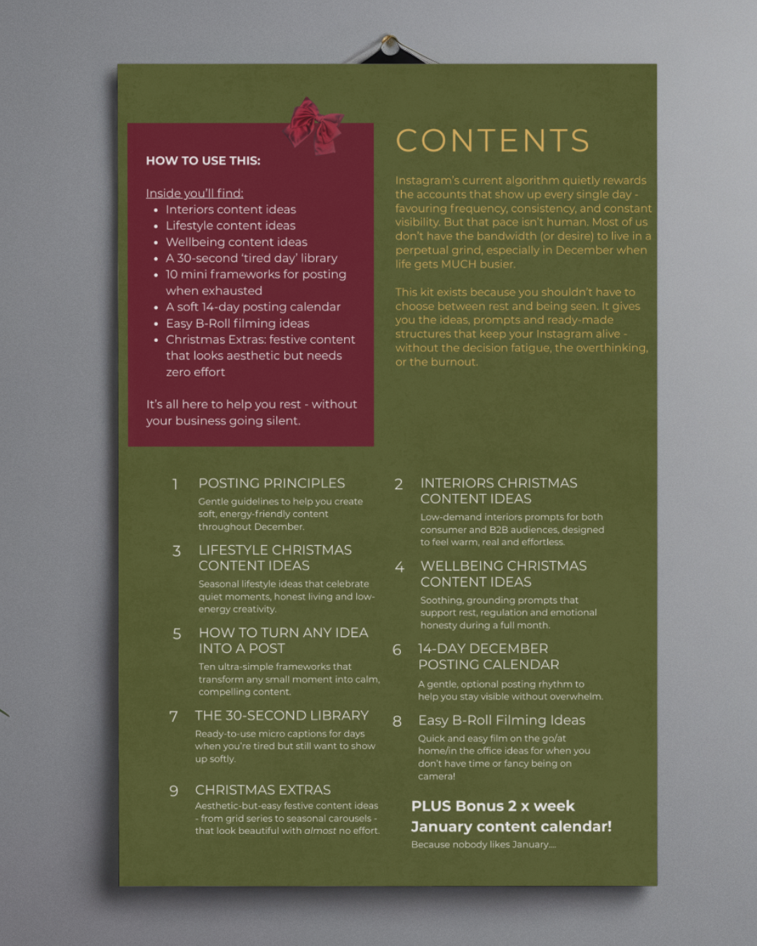 Inside, you’ll find 100+ low-demand, high-quality content ideas for interiors, lifestyle and wellbeing brands, plus ready-to-use captions, filming prompts and a soft posting calendar that takes the pressure off during the busiest month of the year.