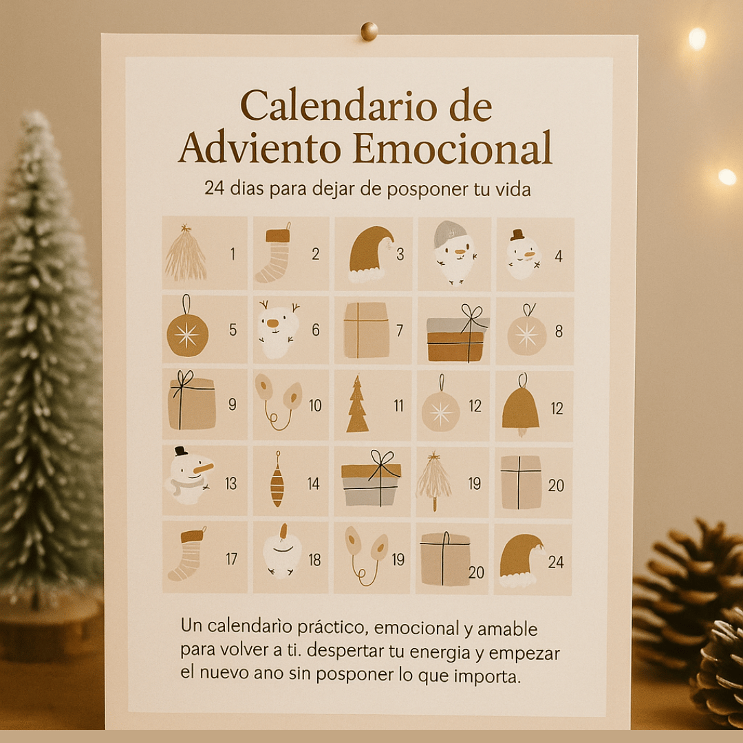Un calendario emocional, práctico y cercano para acompañarte durante 24 días y ayudarte a volver a ti, recuperar claridad y empezar el nuevo año sin posponer lo que importa.