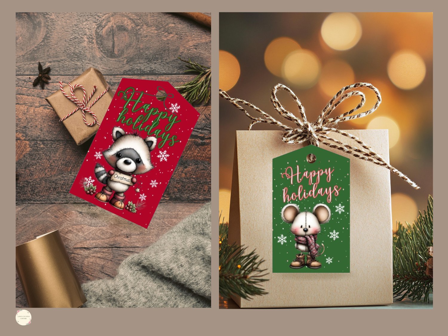 - 1 High-Quality PDF with multiple festive animal snowman tag designs.