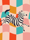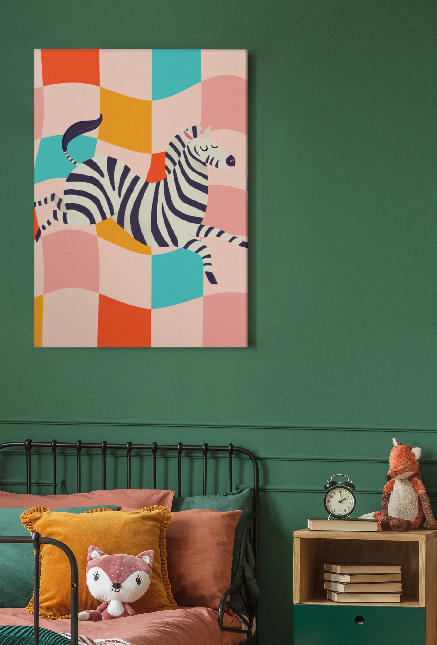 A playful zebra with a funky checkerboard background. Adds fun energy to any child’s space..