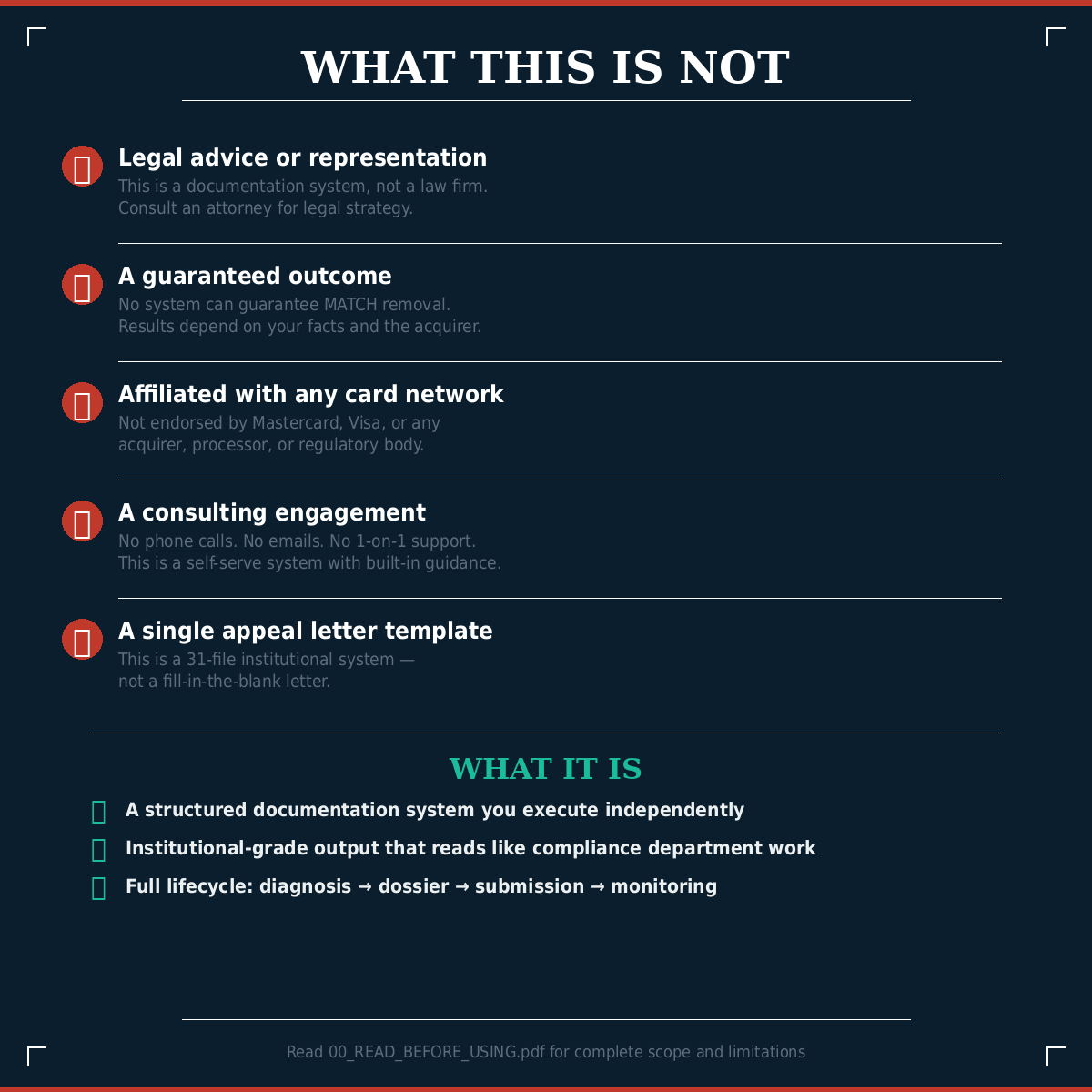 This institutional-grade documentation system gives you the structured compliance architecture required for acquirer reconsideration, underwriting re-entry, and chargeback stabilization.