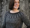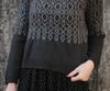 The wearer is 5’10” with a 37” chest circumference. The sample has been worked in size L, giving the wearer 8.75” / 22cm of positive ease at the chest. To allow for the height of the wearer, the sample has been modified by separating the yoke into body and sleeves as for sizes XL-5XL, an extra 2” / 5cm has been worked into the body and an extra 1” / 2.5cm of length has been worked into the sleeves.