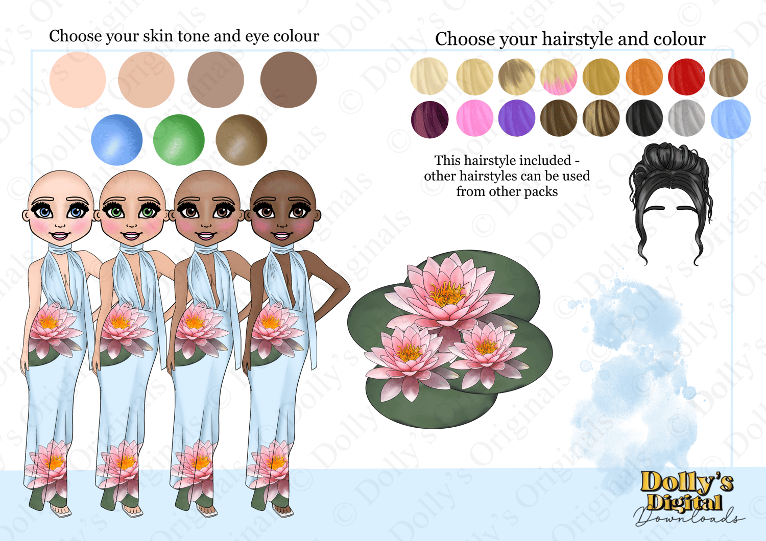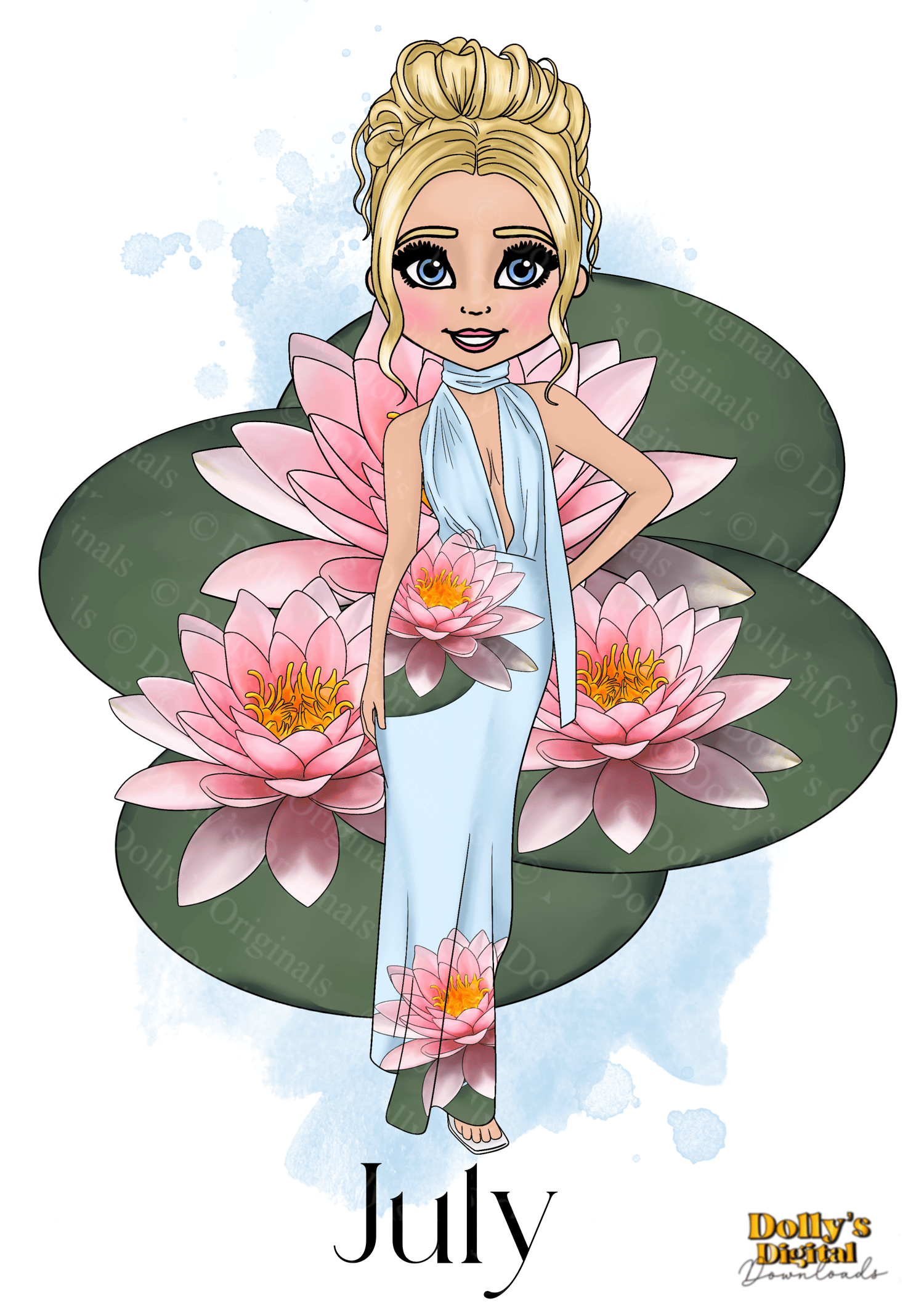 Instant digital download of our Birth Flower July Water Lillies Doll Character Bundle PNG (34 PNG’s)