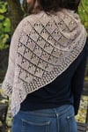 Lil Doudou est un châle triangulaire asymétrique. Travaillé du centre vers les bords, un pan est tricoté en point mousse tandis que l’autre arbore une jolie dentelle.