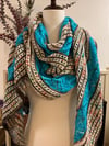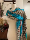 Gauge is not crucial for this wrap and it’s really more important that you are getting a drape that you like with your needle and yarn pairing. You may get more or less repeats of the patterns based on the yardage in your skeins. If you have a yarn scale you can weigh your colors before and after each section to gauge your usage and use as much of your yarn as you can!