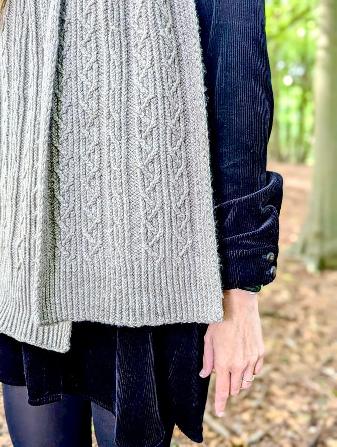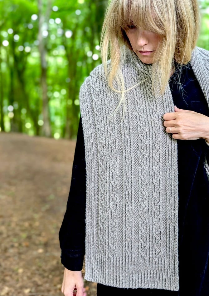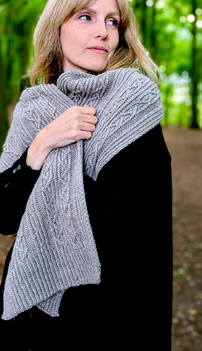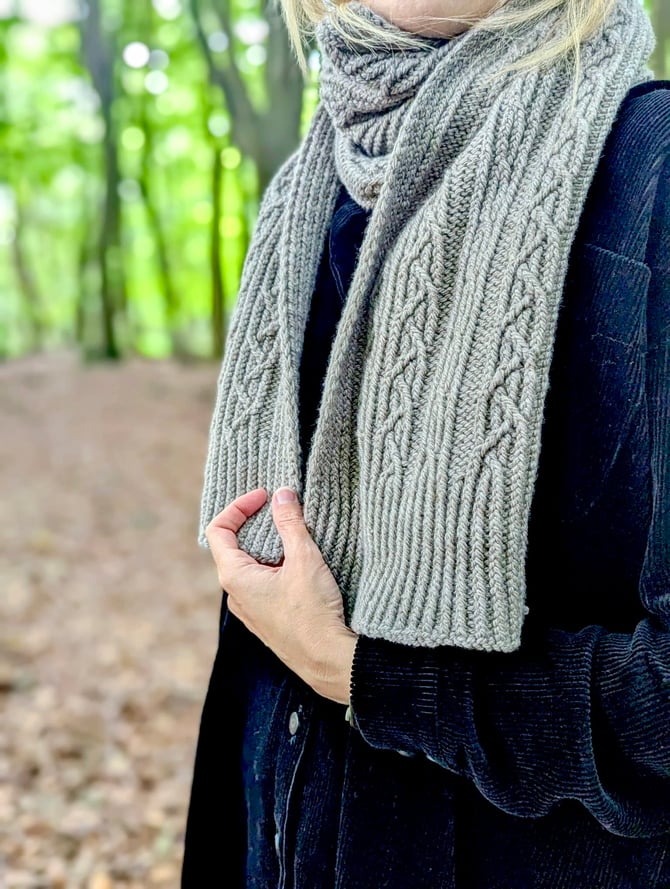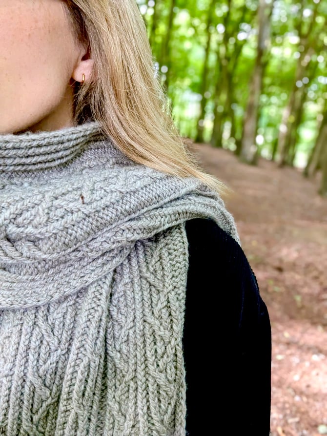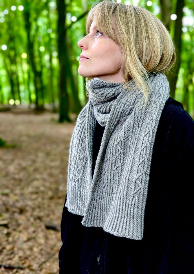 Lothian is a cabled Aran scarf, the perfect addition to any autumn or winter outfit. The delicate cables are featured in panels repeated across the length of the piece, separated by sections of reverse stockinette and twisted rib borders. The delicate cables feature twisted stitches which create an almost vine-like appearance, growing from the wide twisted rib border at either end of the scarf. The cable motif is an easily memorised 8-row repeat, making this a relaxing and uncomplicated knit.