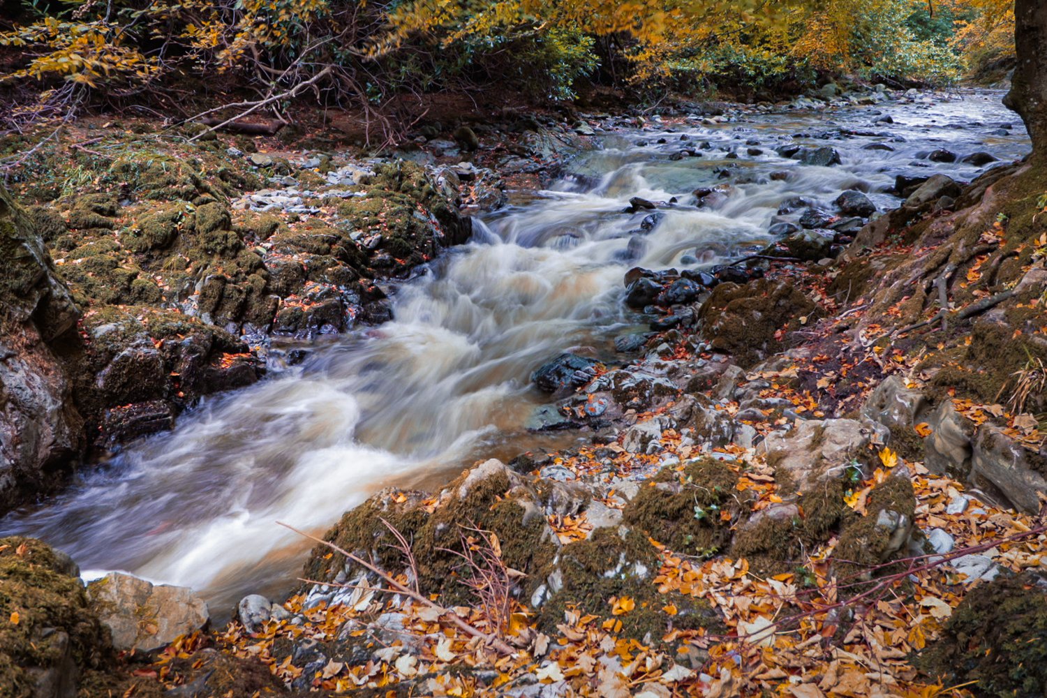 A shallow stream moves steadily through mossy rock and fallen leaves in Tollymore Forest, its motion softened by autumn light and colour. The surrounding woodland feels settled and quiet, shaped by the changing season.