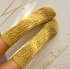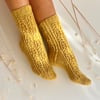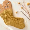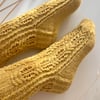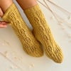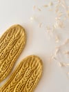 Wrap your feet in the warm embrace of autumn with these knit socks, whose elegant cables and delicate lace evoke the graceful forms of oak and pine forest. Perfect for cozying up by the fire, this pair captures the essence of a crisp fall day, blending the beauty of nature with hand-knitted warmth.