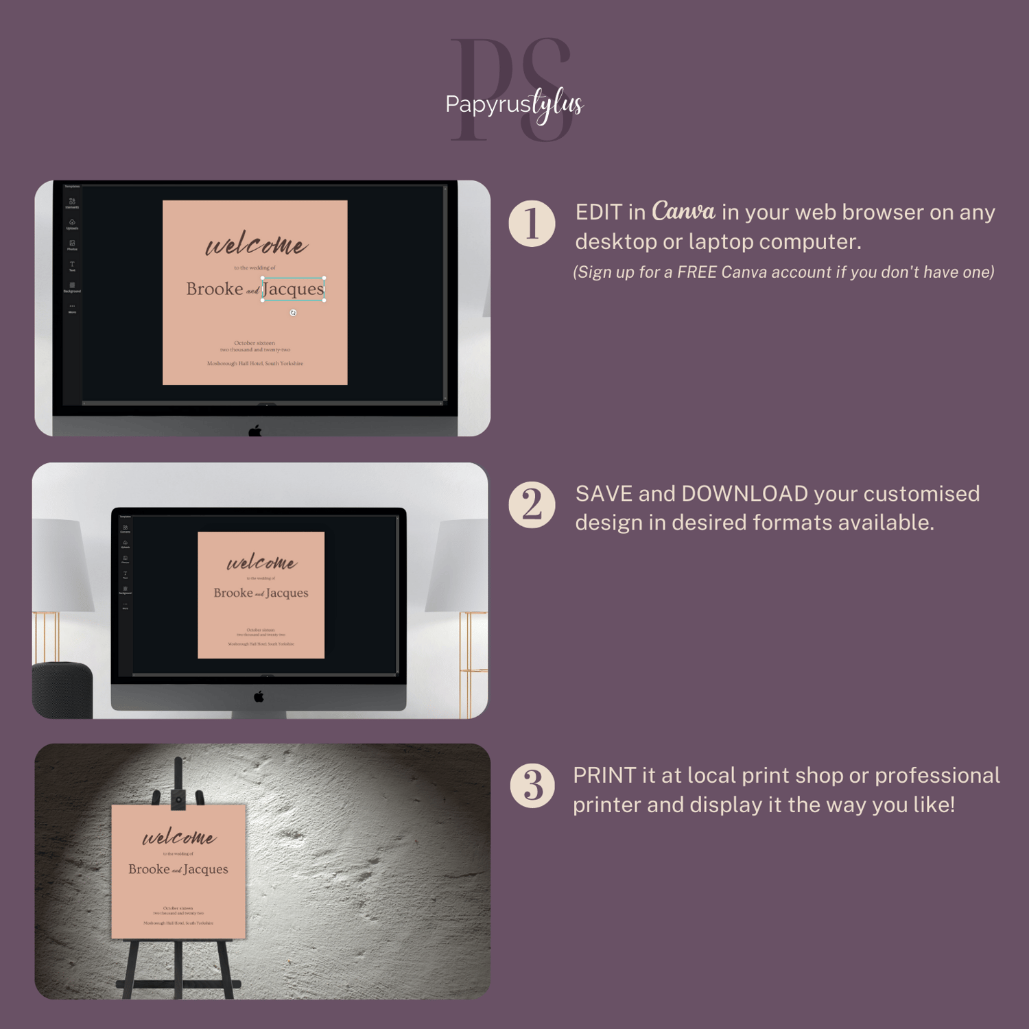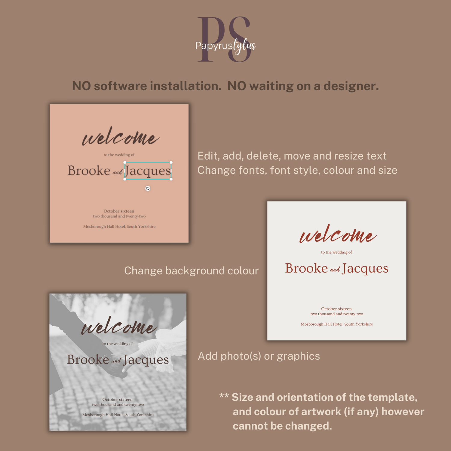 Chic and stylish. While the word "welcome" is presented in a modern script font, your names and essential information are displayed below in a beautiful typography. You can easily customise it, from fonts and colour to background image, to match your wedding theme.